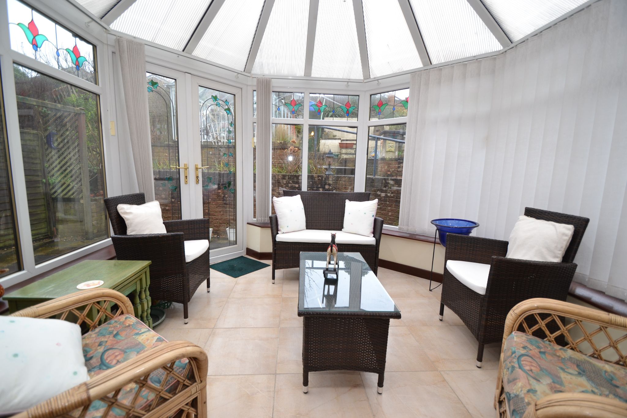 Upvc dg conservatory: Fully tiled floor with under floor heating, fitted blinds, wall mounted convector heater, French doors lead out to the rear garden, ceiling light fan unit.