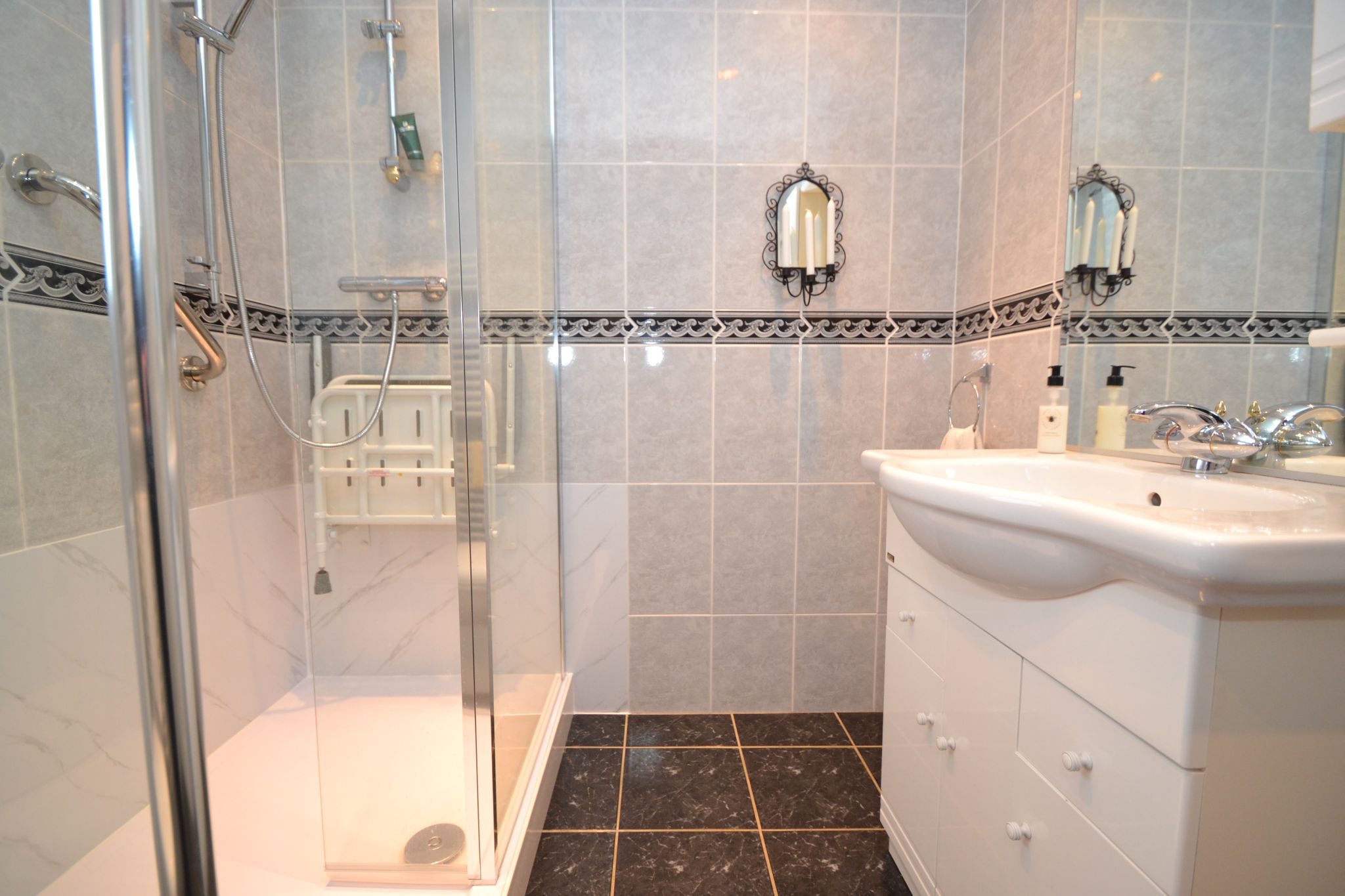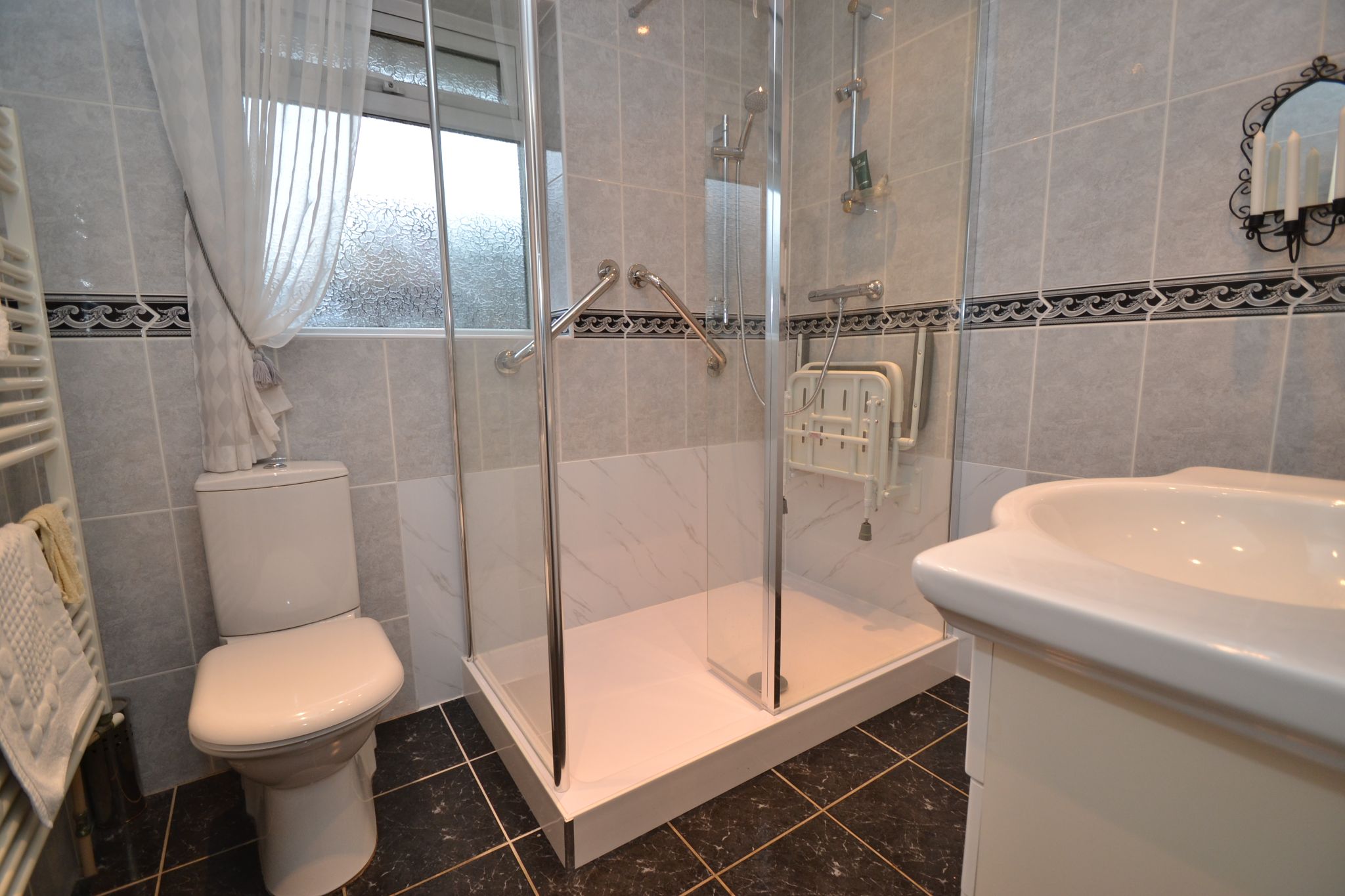Shower Room: 2.24m x 1.95m (7'3 x 6'3). Recently installed walk in shower cubicle with a chrome thermostatically controlled shower unit (10/25), wash basin set on a high gloss vanity unit, wc, fully tiled, friosted Upvc dg window, heated towel rail, tiled floor, inset ceiling lights.