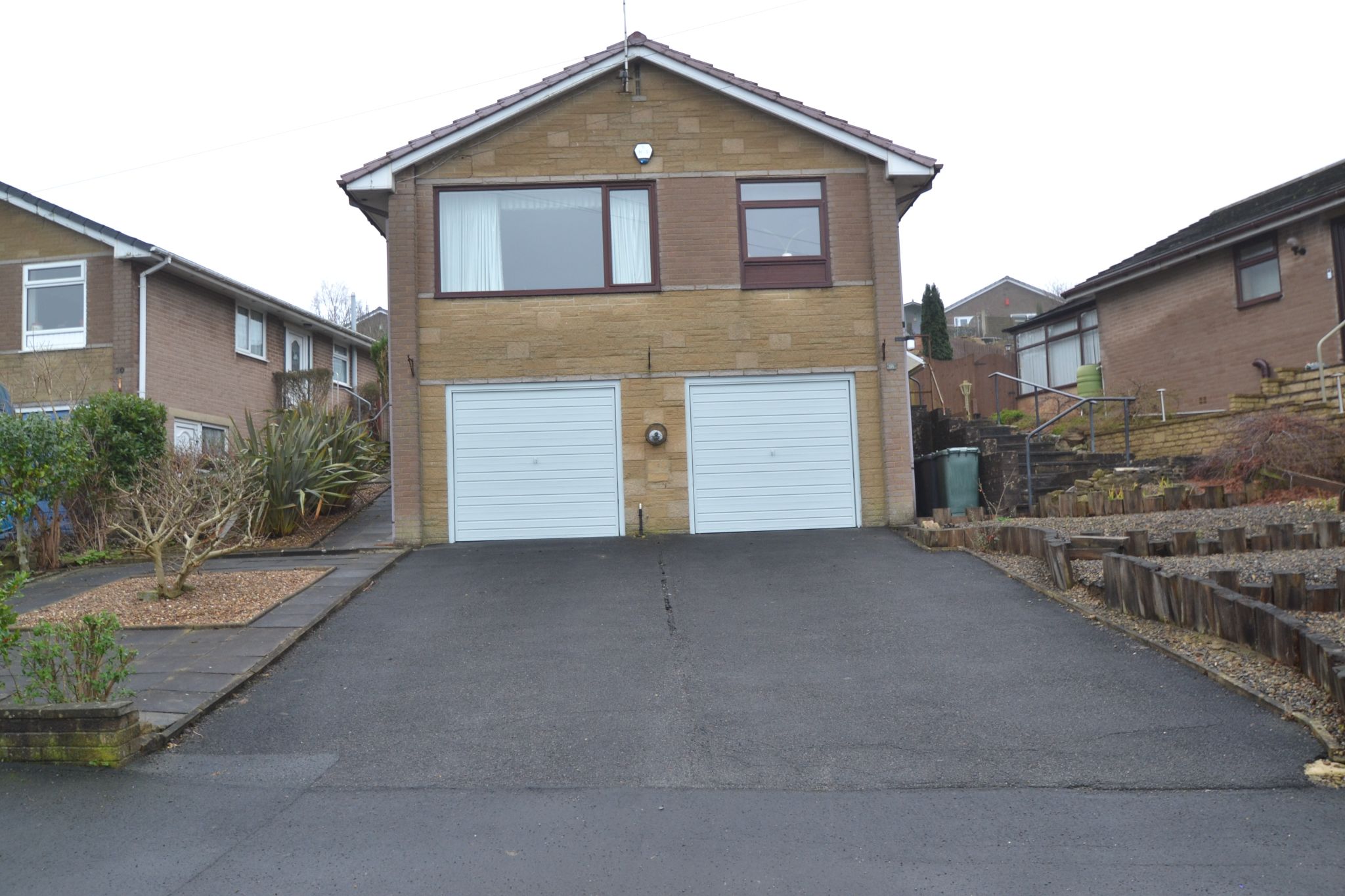Externally. To the front is a low maintenance garden area, front tarmac drive for 3/4 cars in front of the garage. Side steps to the property with fencing and gated access to a flagged side patio area. Rear flagged patio behind the conservatory and beyond, with two flight of steps to to a tiered garden with patios and a large greenhouse. Excellent views from here.