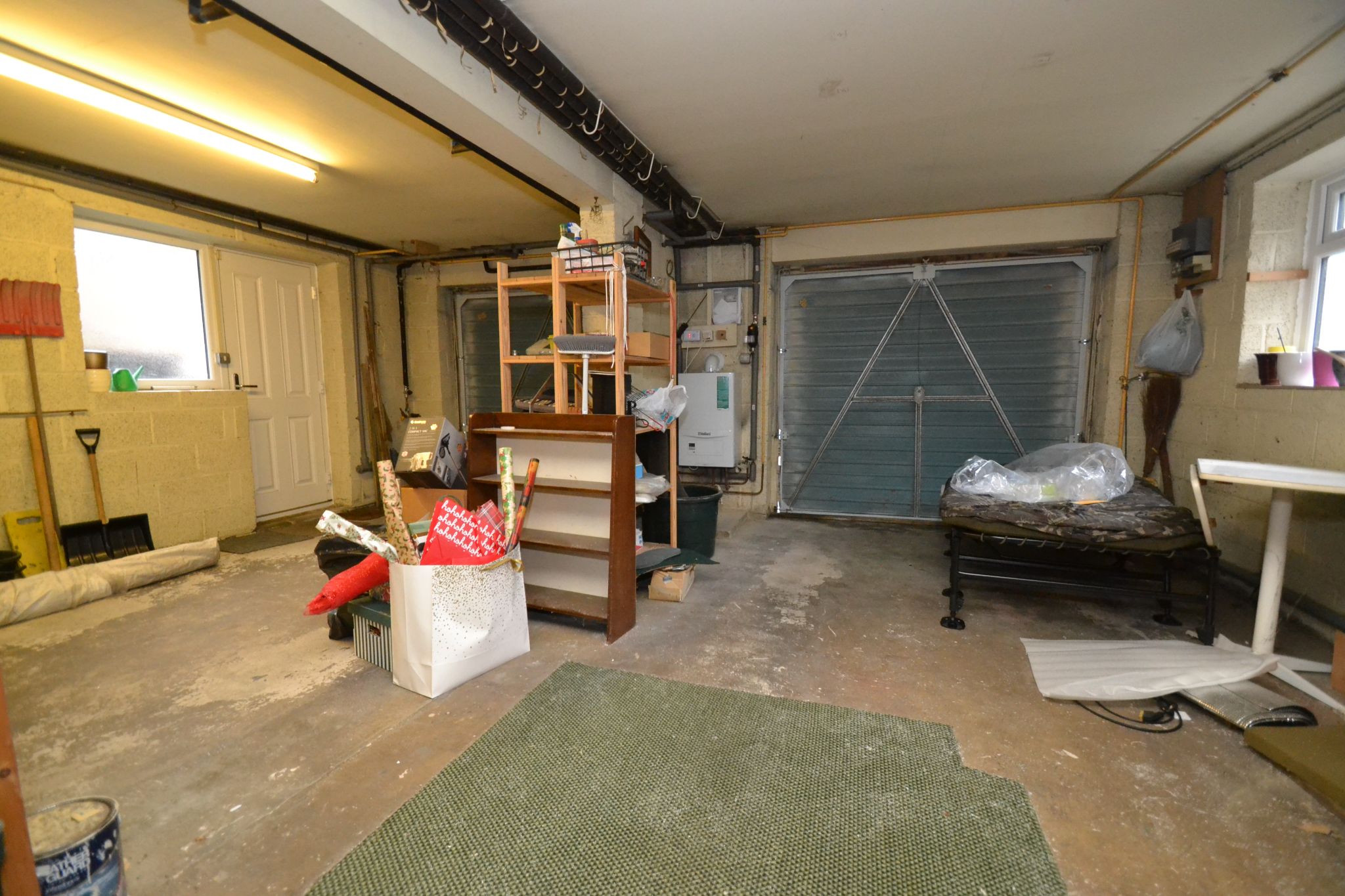 Double Garage: 6.39m x 6.05m (20'9 x 19'8). Two up and over doors, side door access, wall mounted Vaillant Eco-tec Pro 28 condensing combi-boiler, built in cupboards, two frosted side Upvc dg windows, alarm panel. access door into:-