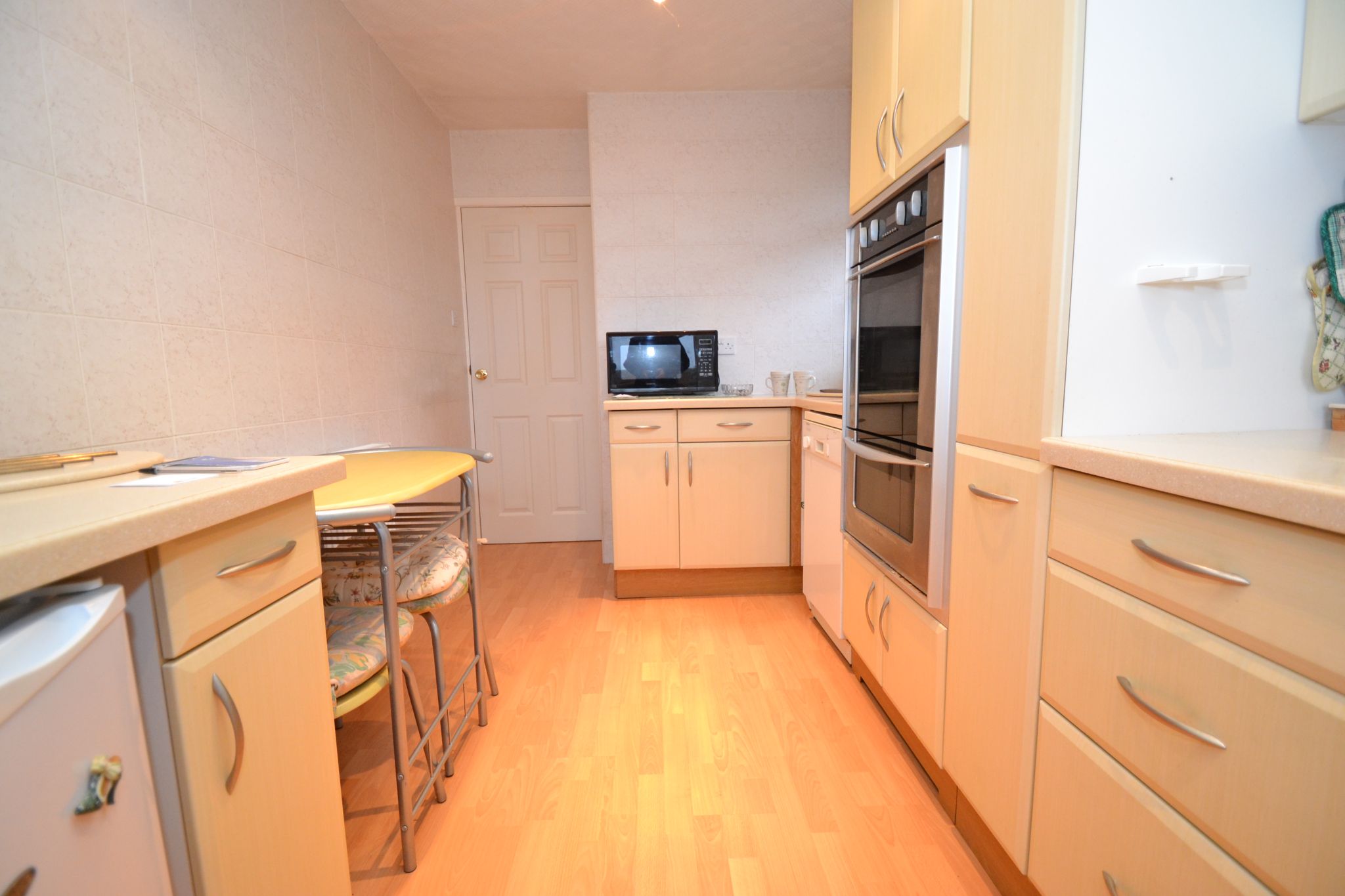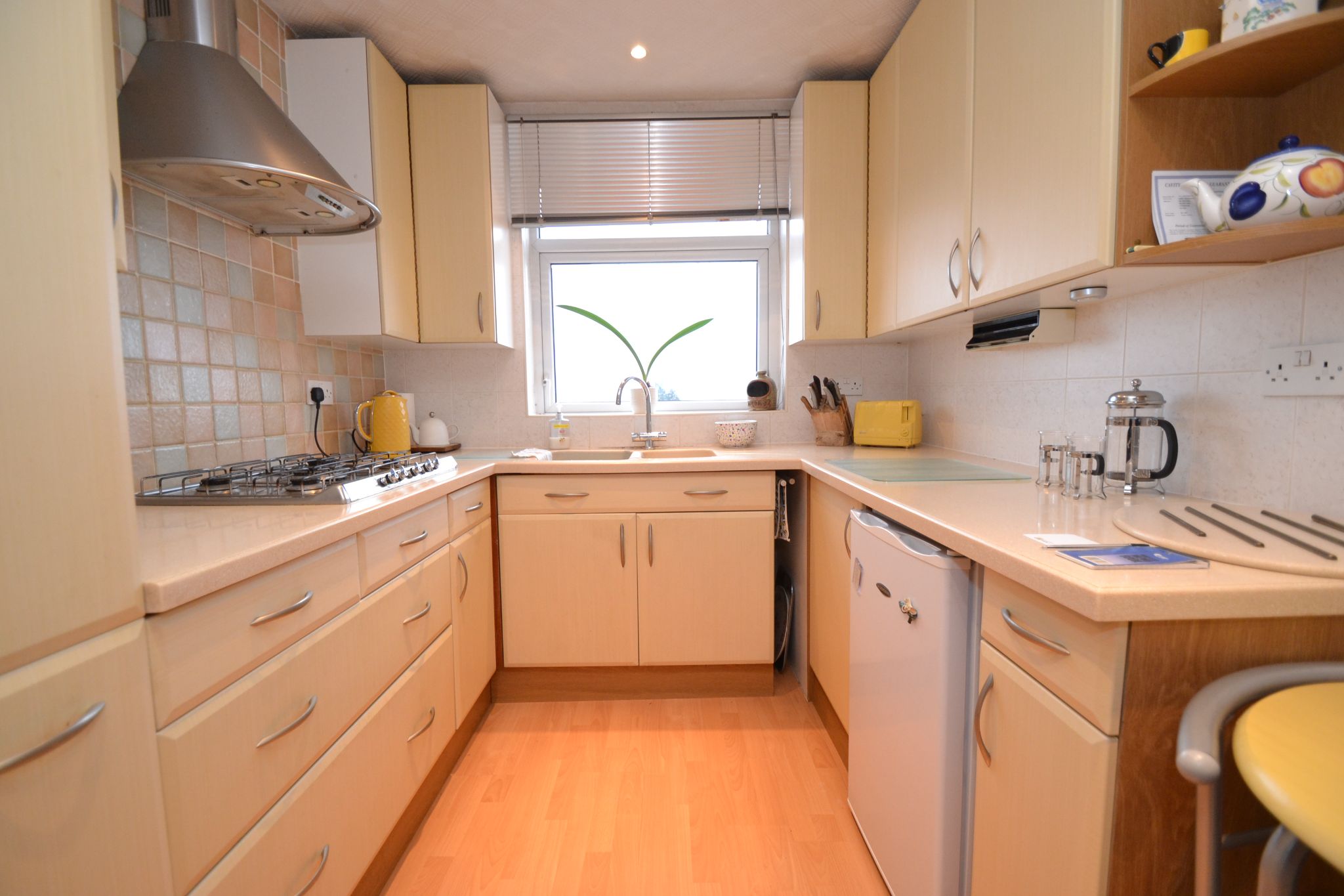 Kitchen: 4.49m x 2.34m (14'7 x 7'6). Range of modern wall & base unit in maple, work tops with tiling above, stainless steel extractor over a 5 ring gas hob in stainless steel, built in double electric fan assist oven, 1.5 sink with a mixer tap, space for a fridge, plumbed for a slimline dishwasher, radiator, laminate floor, Upvc dg window to front, inset ceiling lights.