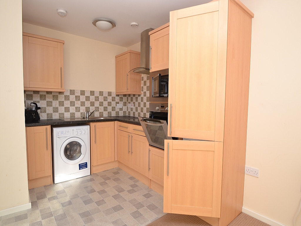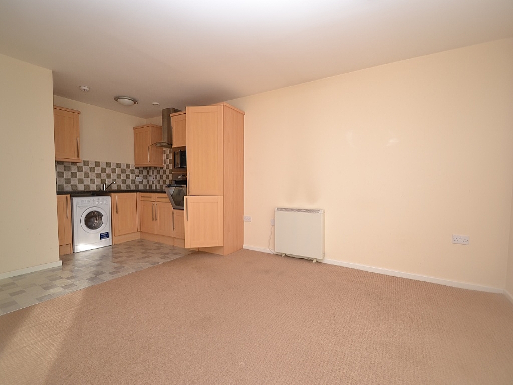 Modern 1 bedroom unfurnished top floor Penthouse apartment with the advantage of a balcony, comprising staircase from ground floor communal security entrance and intercom, hallway, lounge with kitchenette in beech with integrated microwave, hob, oven, extractor, fridge freezer, auto-washer dryer, double bedroom, contemporary bathroom in white with shower over the bath, electric heating part storage, Upvc dg, parking. NO DSS OR PETS, NON SMOKERS ONLY -