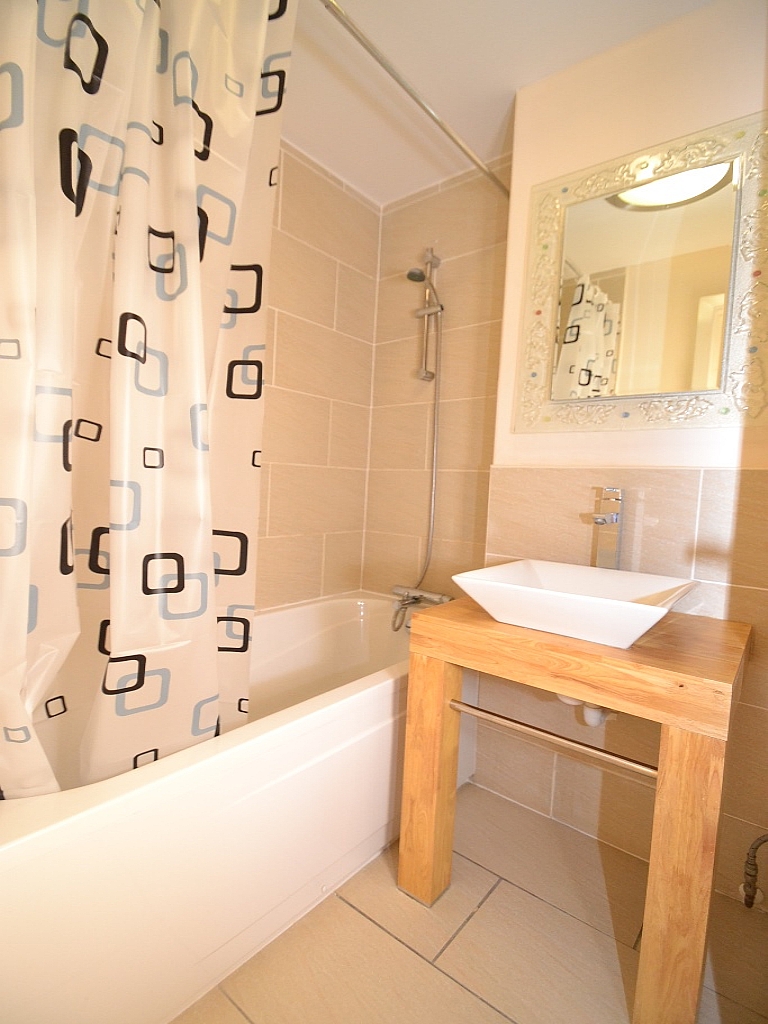 Bathroom: Modern three piece suite in white, chrome shower unit over the bath, rail & curtain, extractor, heated chrome towel rail.