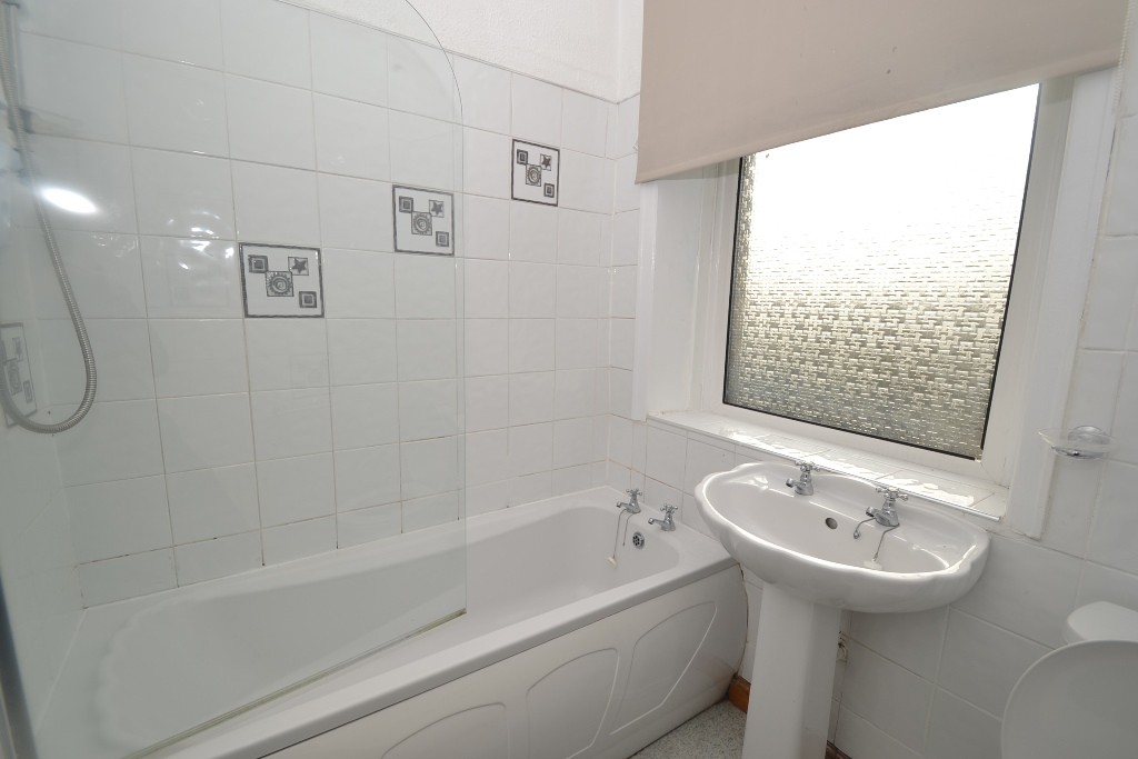 Three piece suite in white, part tiled, electric shower over the bath, screen, frosted Upcv dg window, ch radiator.