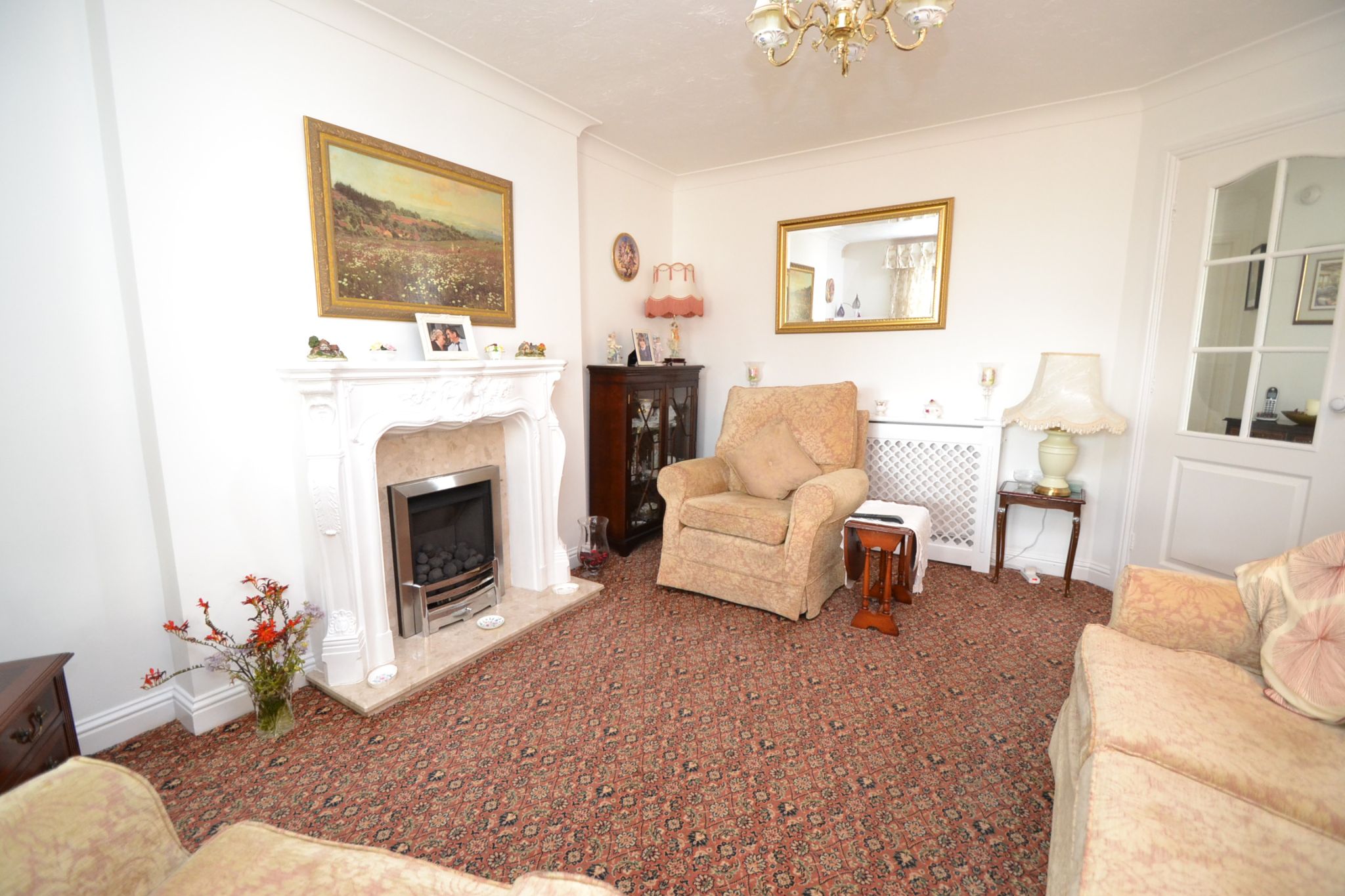Lounge: 4.41m x 3.41m (14'5 x 11'2). Louis style fireplace surround with marble back and hearth, stainless steel coal effect gas fire, coving, Upvc dg patio doors to rear, ch radiator.
