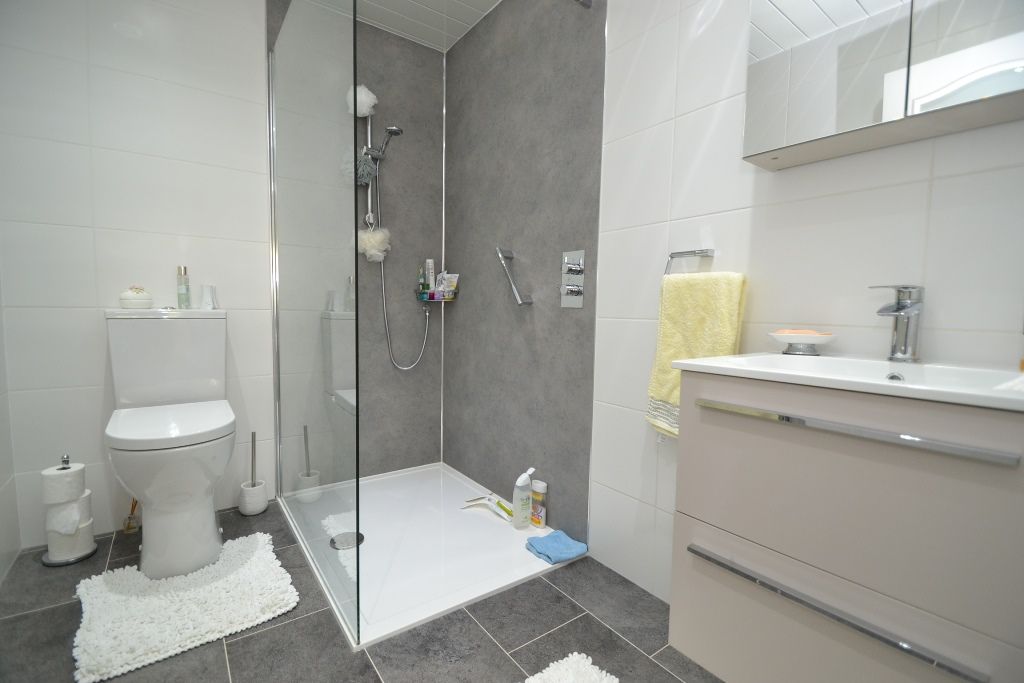 Shower Room: 2.40m x 1.75m (7'10 x 5'9). Superb walk in shower with glass screen and chrome thermostatically controlled shower unit, wash basin on a vanity unity, wc in white with chrome fittings, heated chrome towel rail, fully tiled with Upvc cladded ceiling and lighting, vanity cupboard.