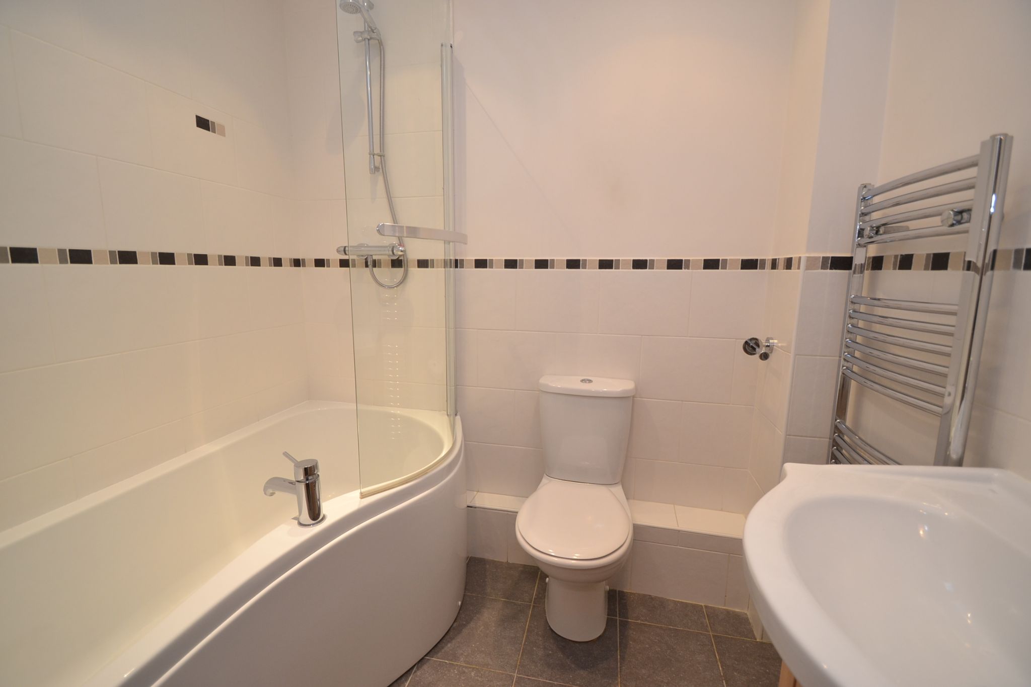 Main Bathroom: 2.08m x 1.66m (6'9 x 5'5). Three piece P shaped bath with shower screen and chrome thermostatically controlled shower unit over the bath, part tiled, heated chrome towel rail, wc and wash basin on a base vanity unit, extractor, inset ceiling lights.