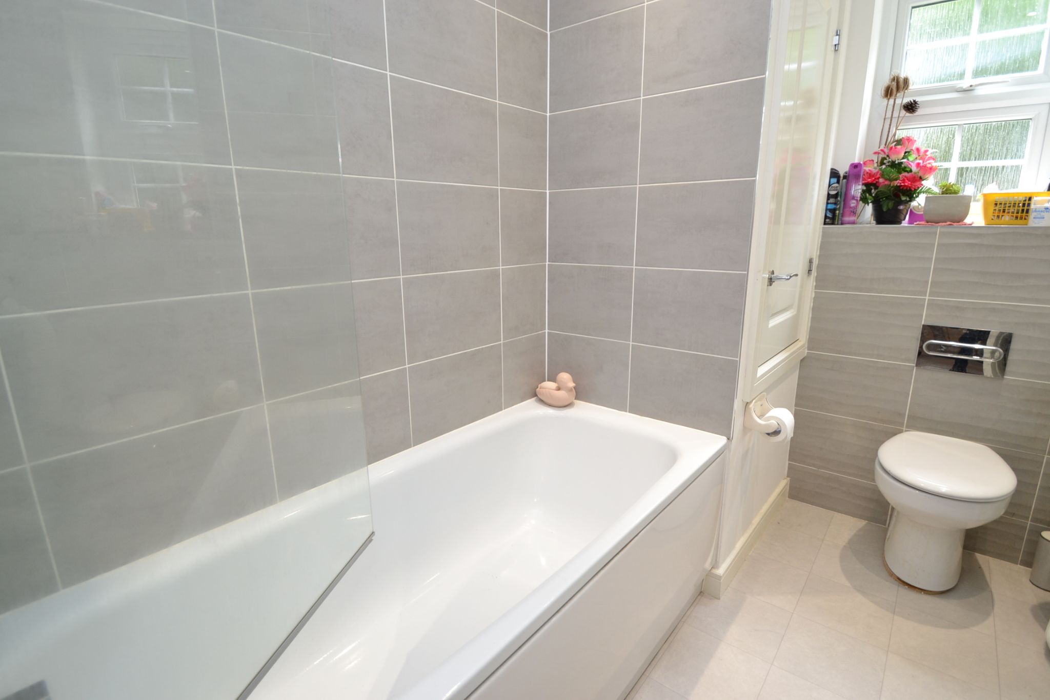 BATHROOM: 2.79m (9' 2") x 1.82m (6"11). Three piece suite in white , shower screen with chrome thermostat shower unit over the bath, part tiled, frosted Upvc dg window, extractor system, heated chrome towel rail, inset ceiling lights, airing cupboard houses the Logic condensing boiler.