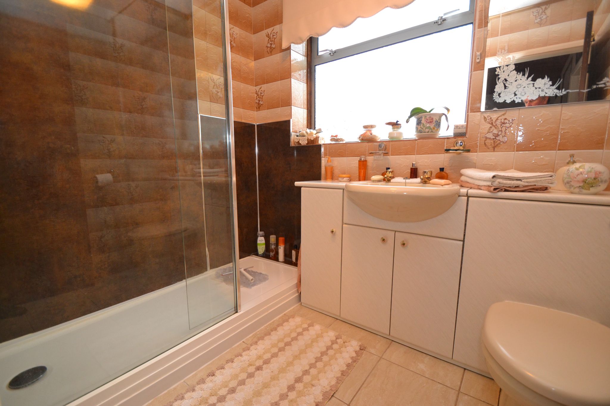 Shower Room: Modern walk in shower cubicle with a thermostatically controlled shower unit, wash basin set in a vanity unit and cistern, fully tiled, double radiator, frosted dg window.