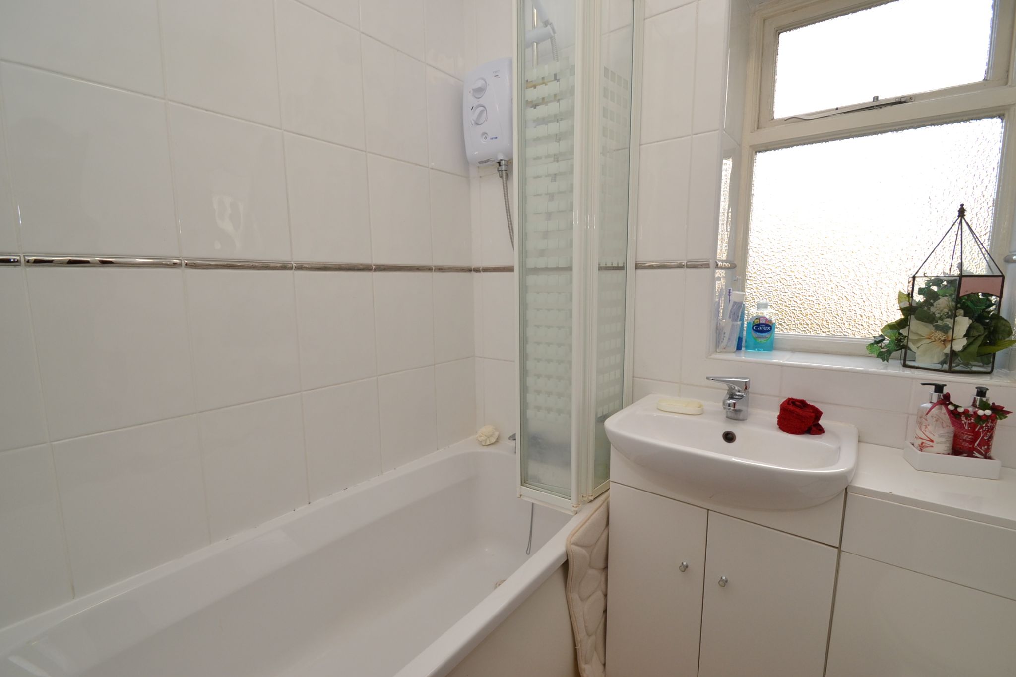 Bathroom: Three piece suite in white, fully tiled, electric Triton shower over the bath, frosted window, radiator, wash basin and wc all enclosed.