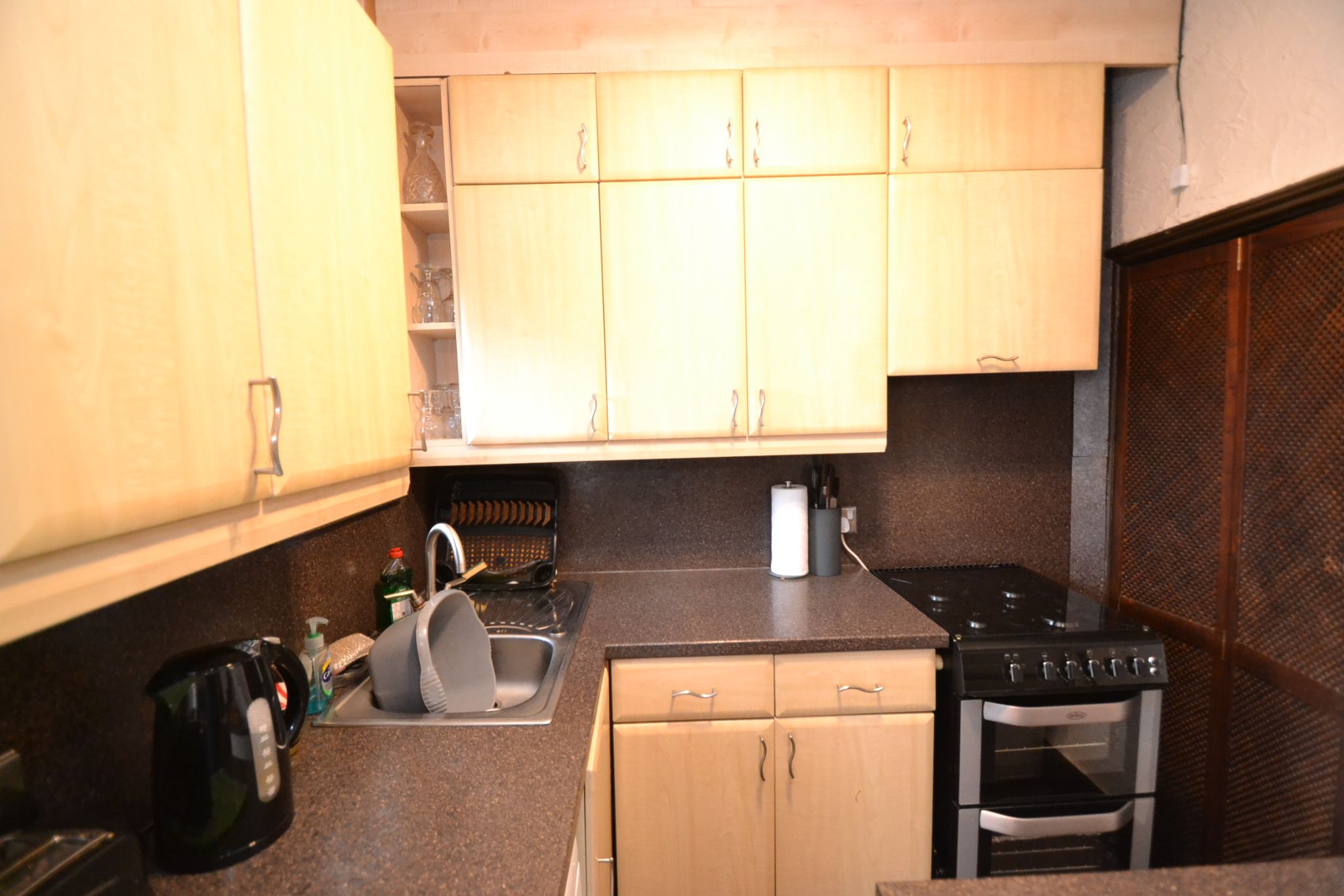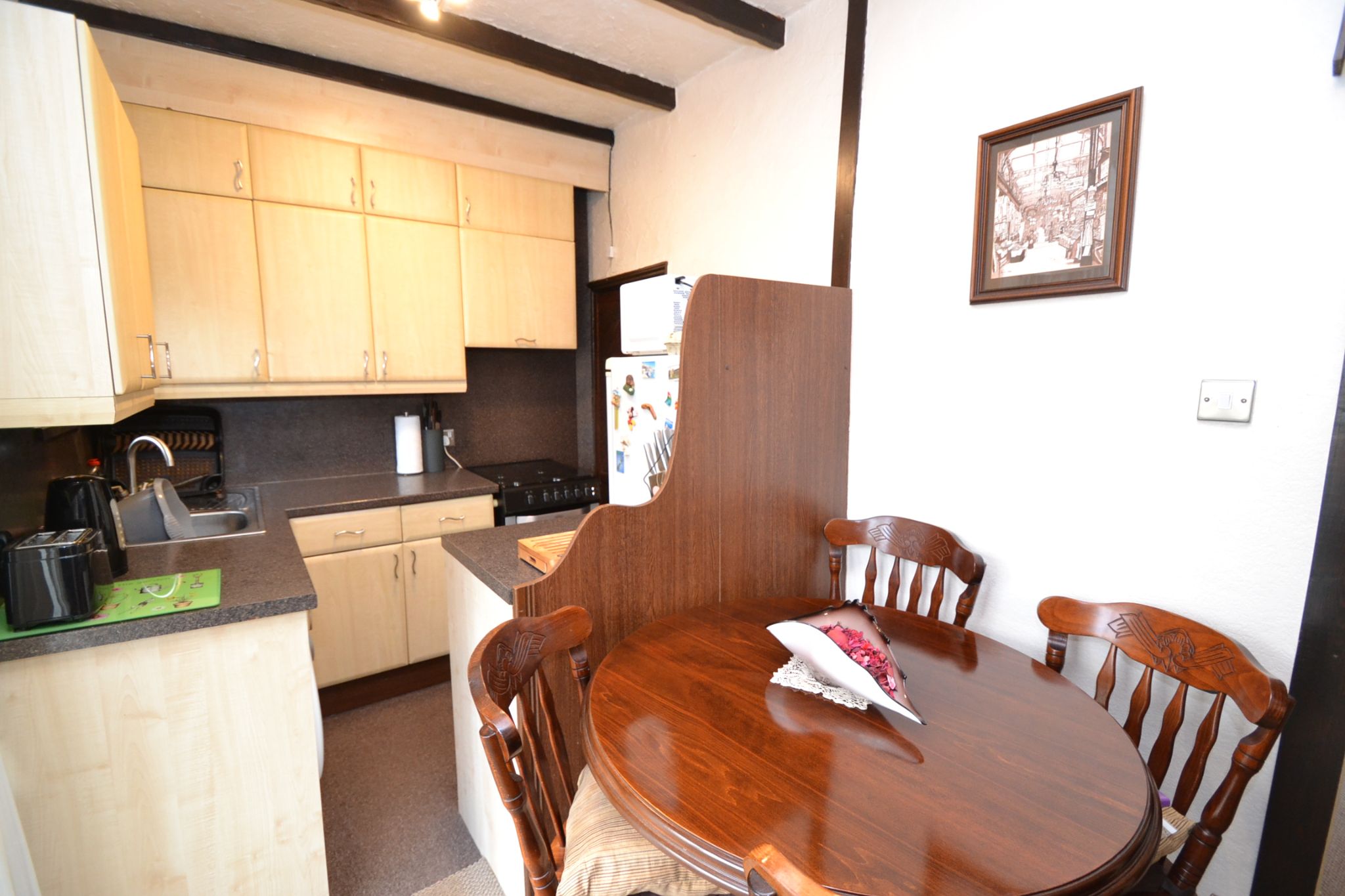 Kitchen Dining Room: 4.80m x 2.21m (15'9 x 7'3). Range of wall & base units in maple, work tops with matching splash backs, gas cooker to remain, stainless steel sink with a mixer tap, plumbed for an auto-washer, space for a tall boy fridge freezer, wood dg window to rear plus wood grain Upvc dg patio doors, understairs storage, space for a table and chairs, display fireplace feature, built in cupboards, beams to ceiling.