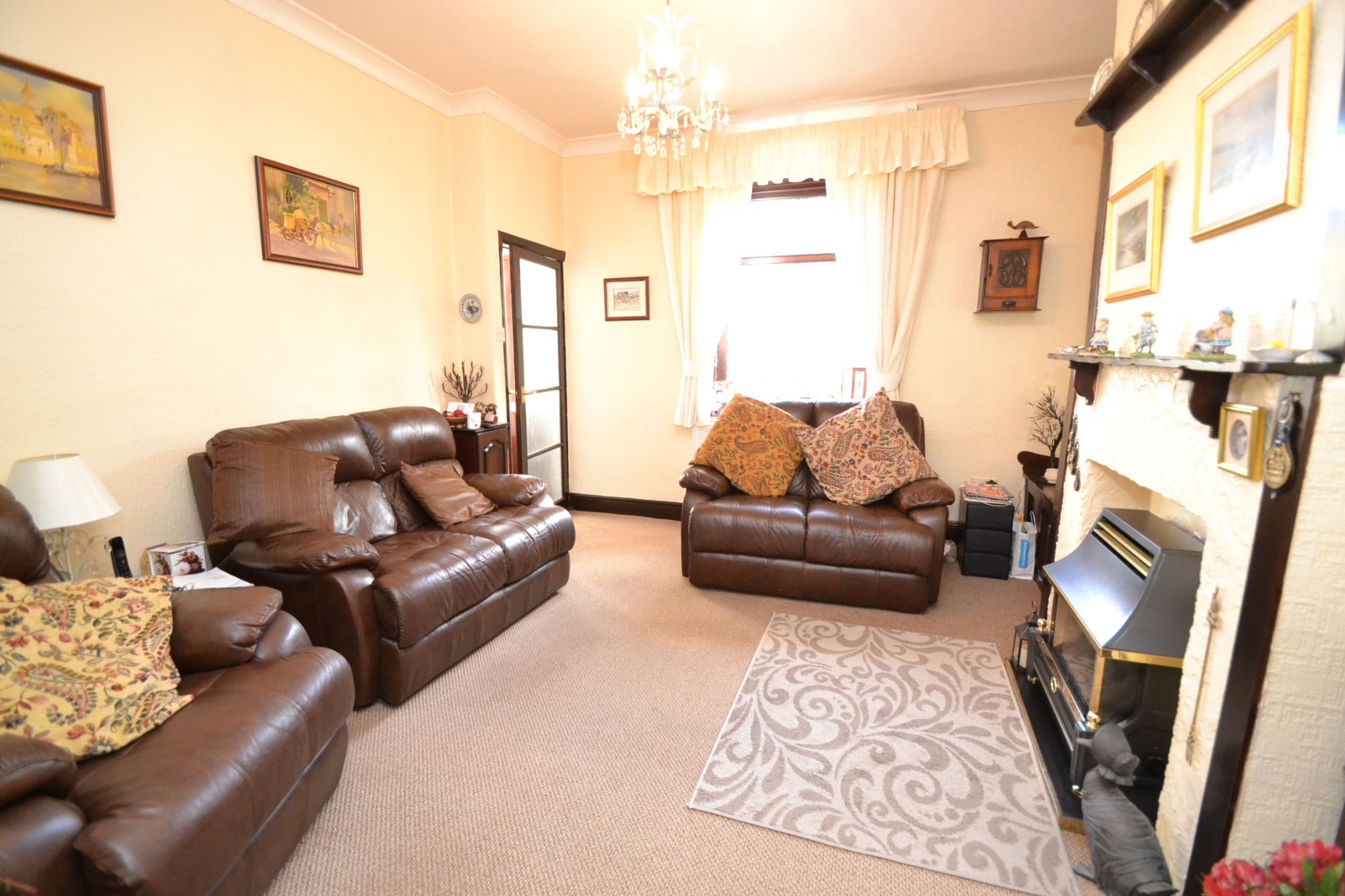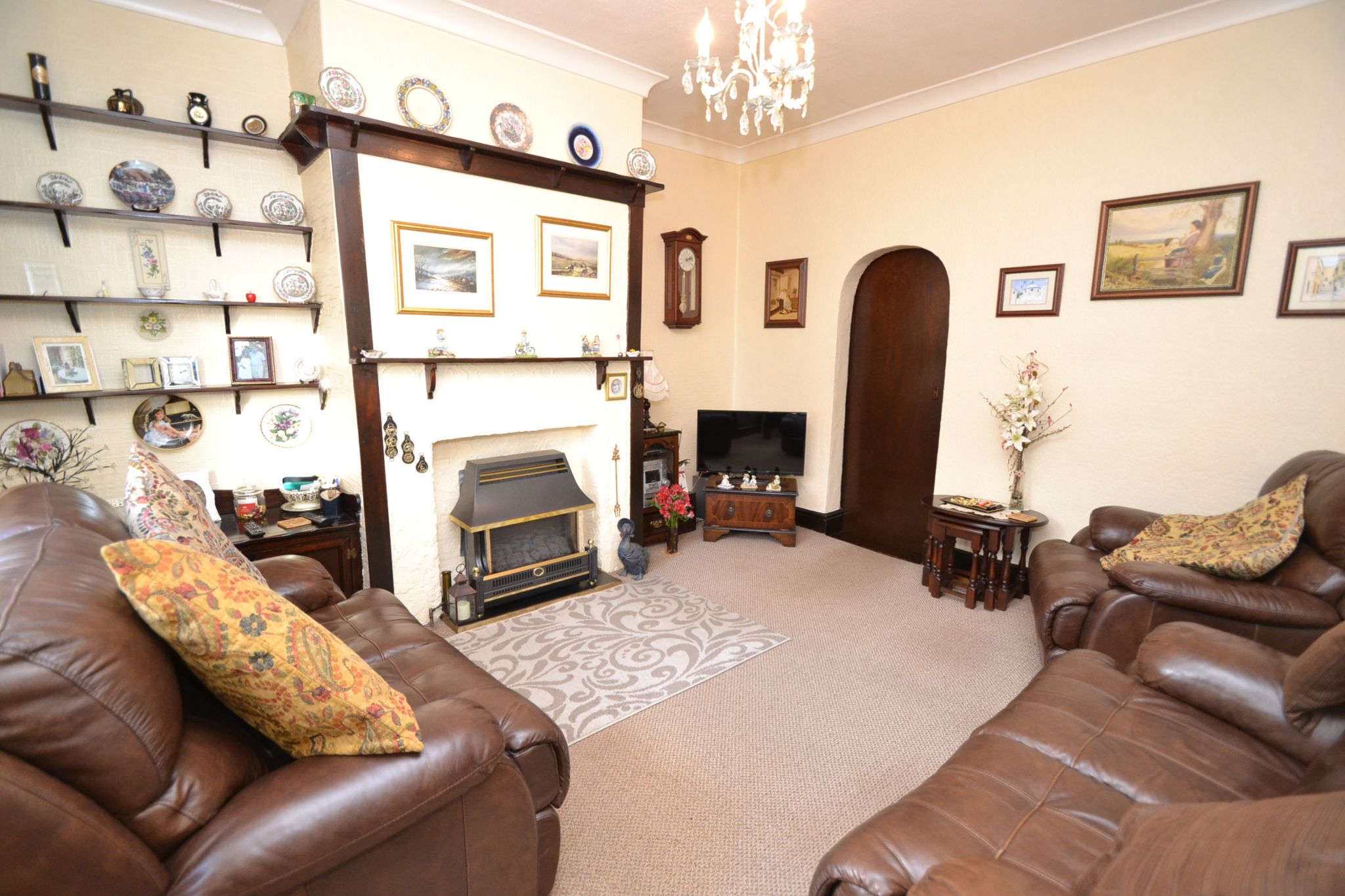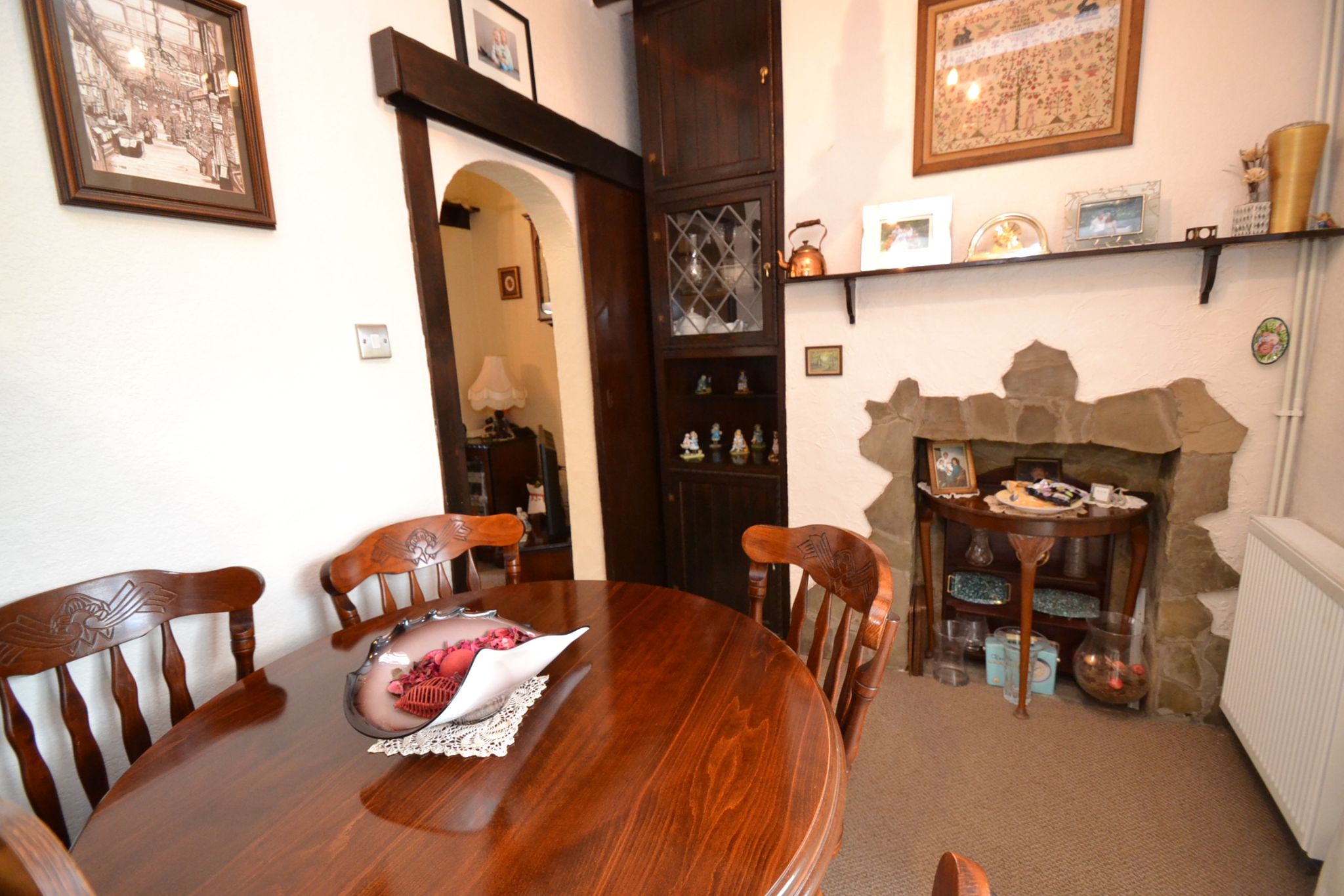 Lounge: 4.1m x 3.81m (13'6 x 12'6). Upvc dg diamond leaded wood grain bay window to front, cottage style decor and wood features with a delft rack, fireplace with a gas fire, radiator, archway leads onto the:-