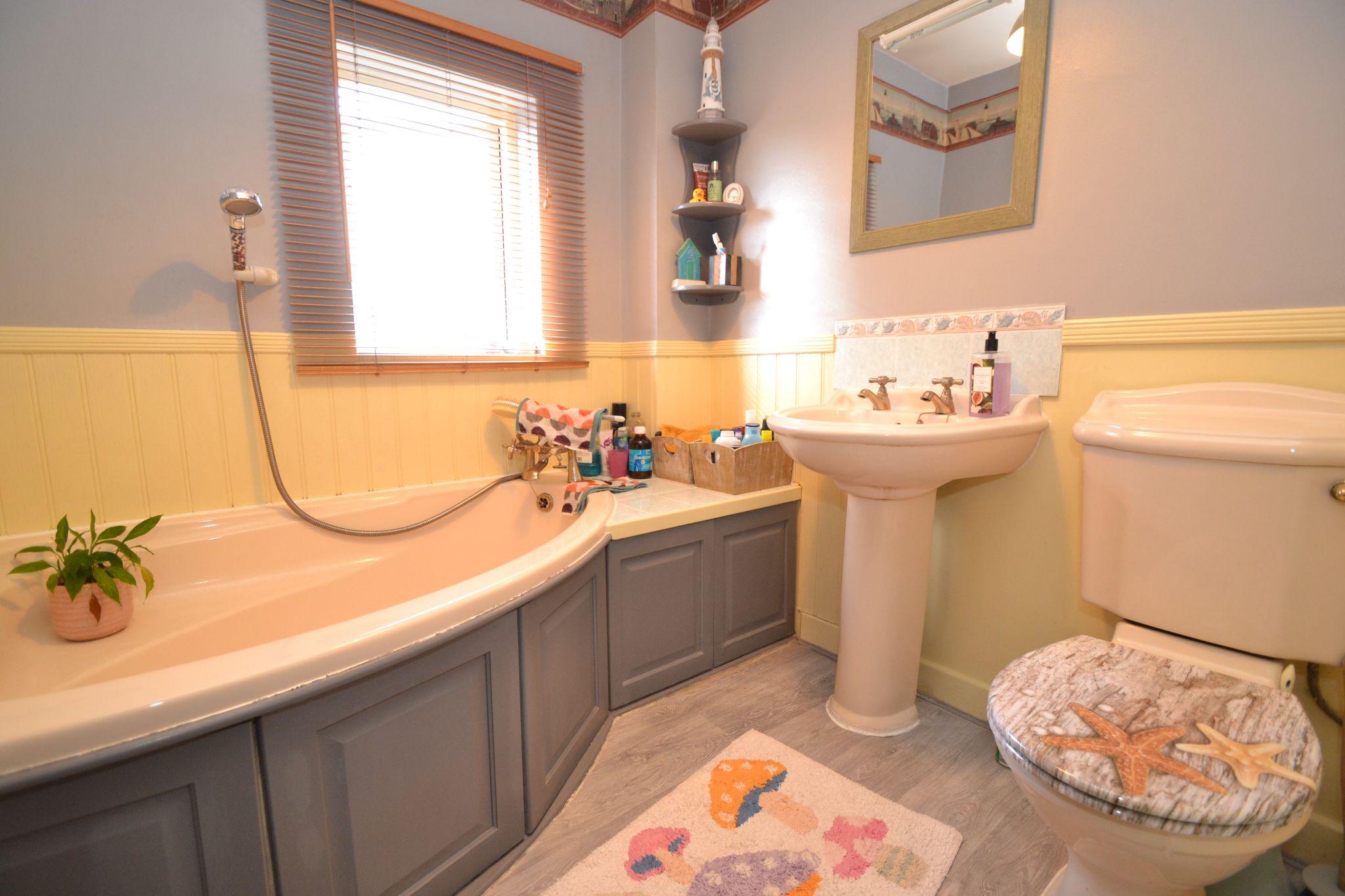 Bathroom: Three piece corner suite comprising; W.C, wash hand basin, corner bath, a radiator and a window to the side elevation.