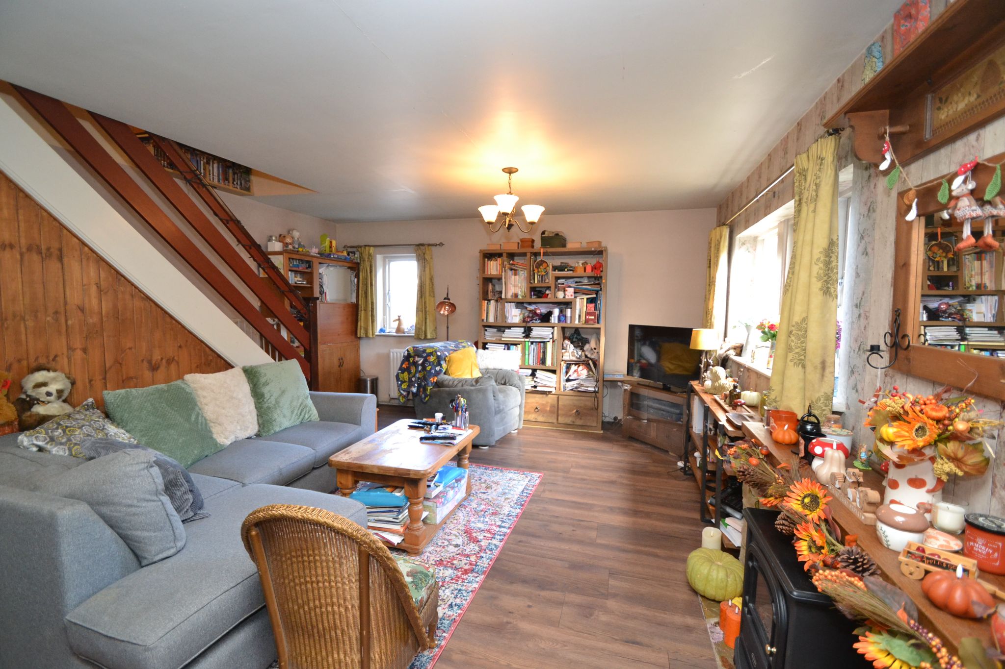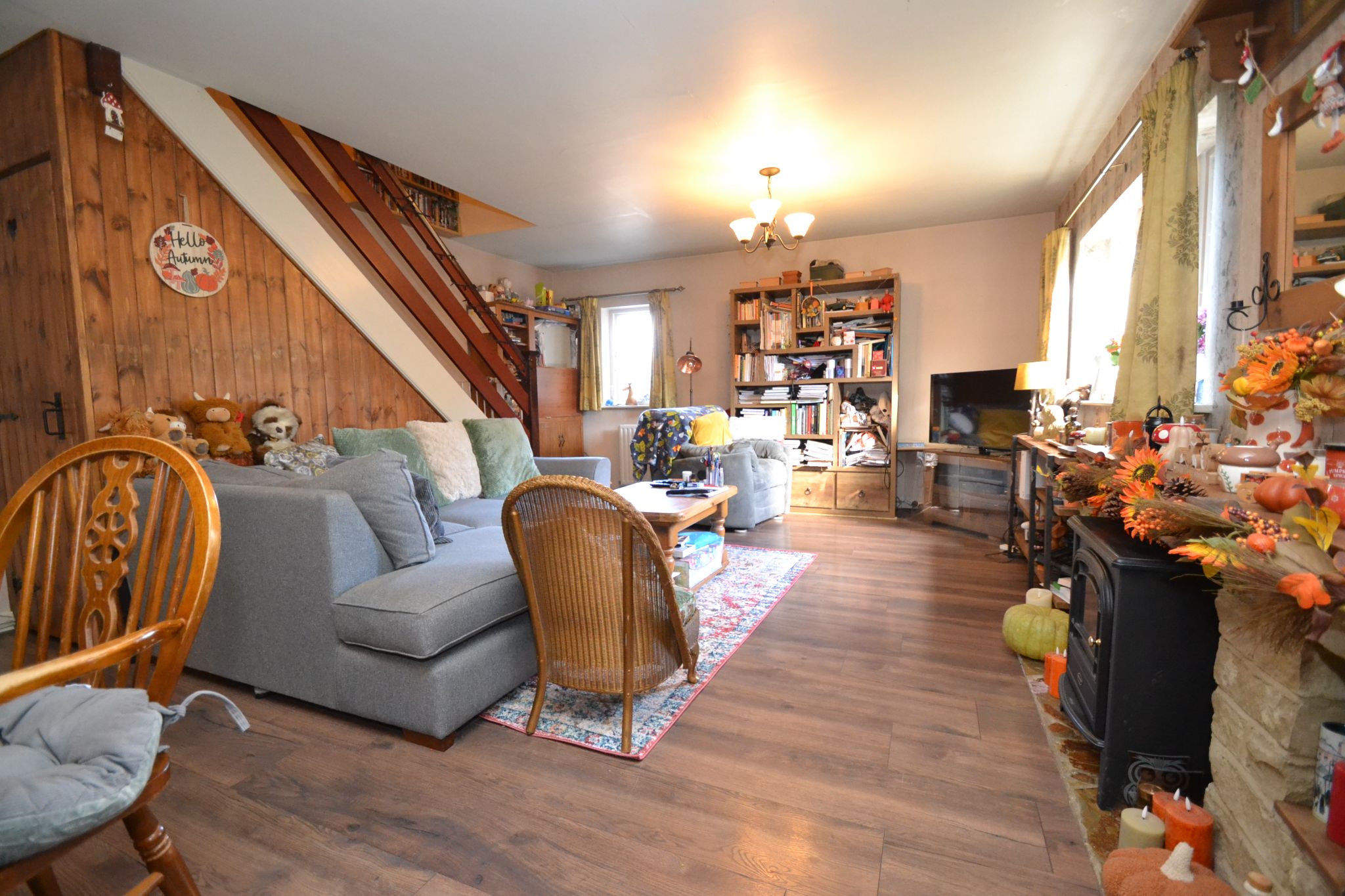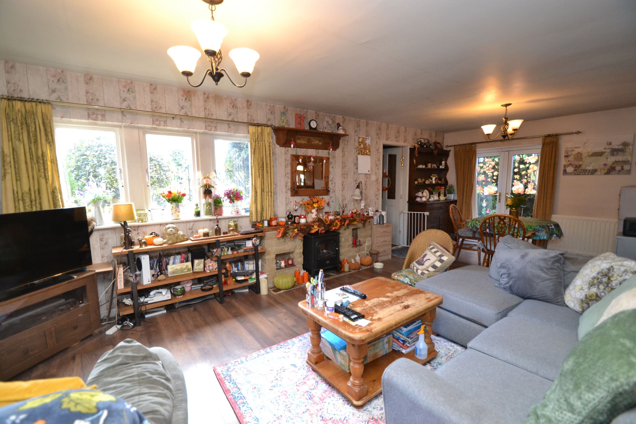 Lounge Dining Room: 24' x 14' 9" ( 7.32m x 4.50m ). Having a stone feature fireplace with a space for an electric stove, stairs to the first floor, radiators, a window to the front and side elevations and Upvc dg French doors windows leading out to the side garden, under stairs storage.