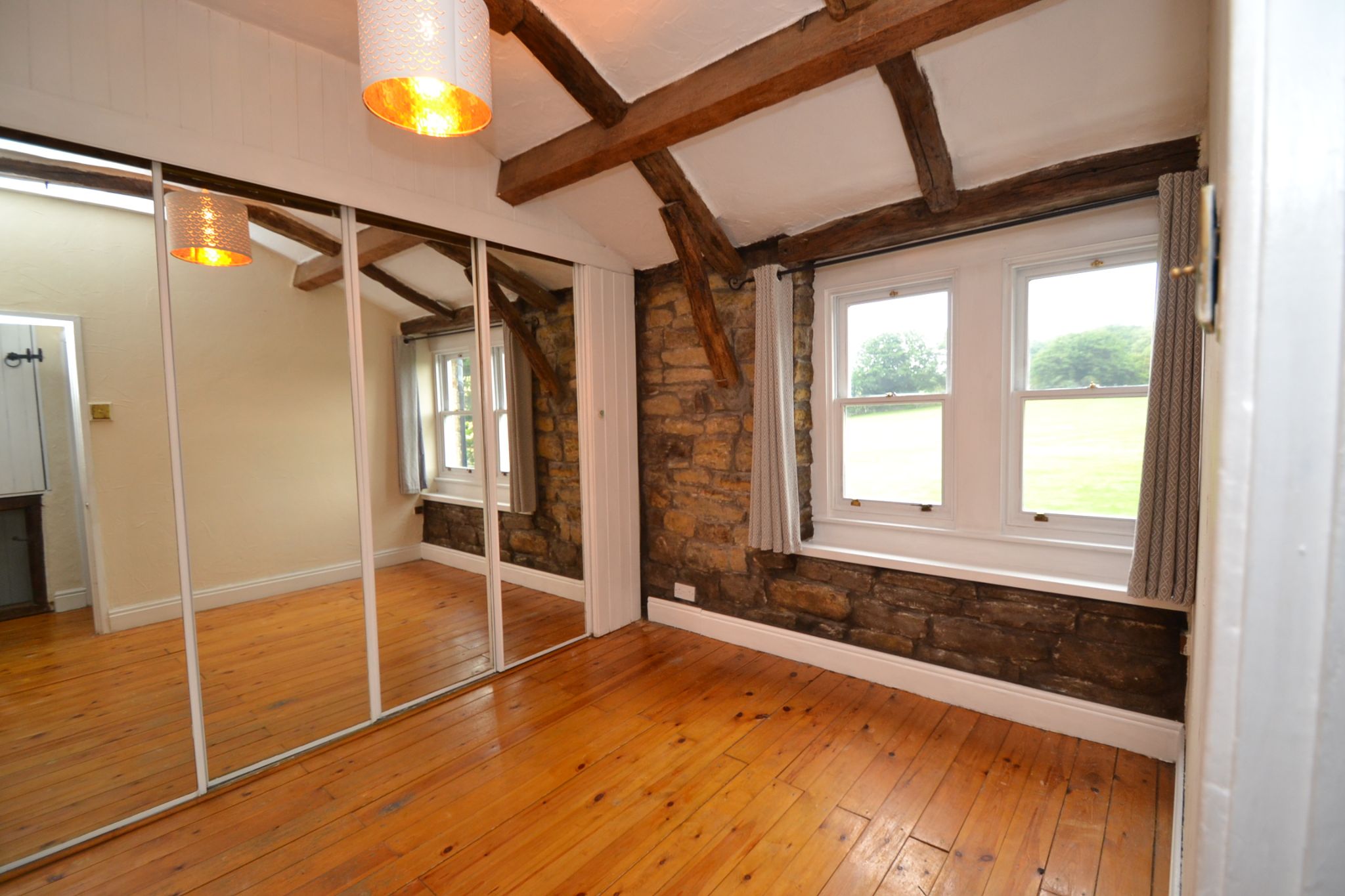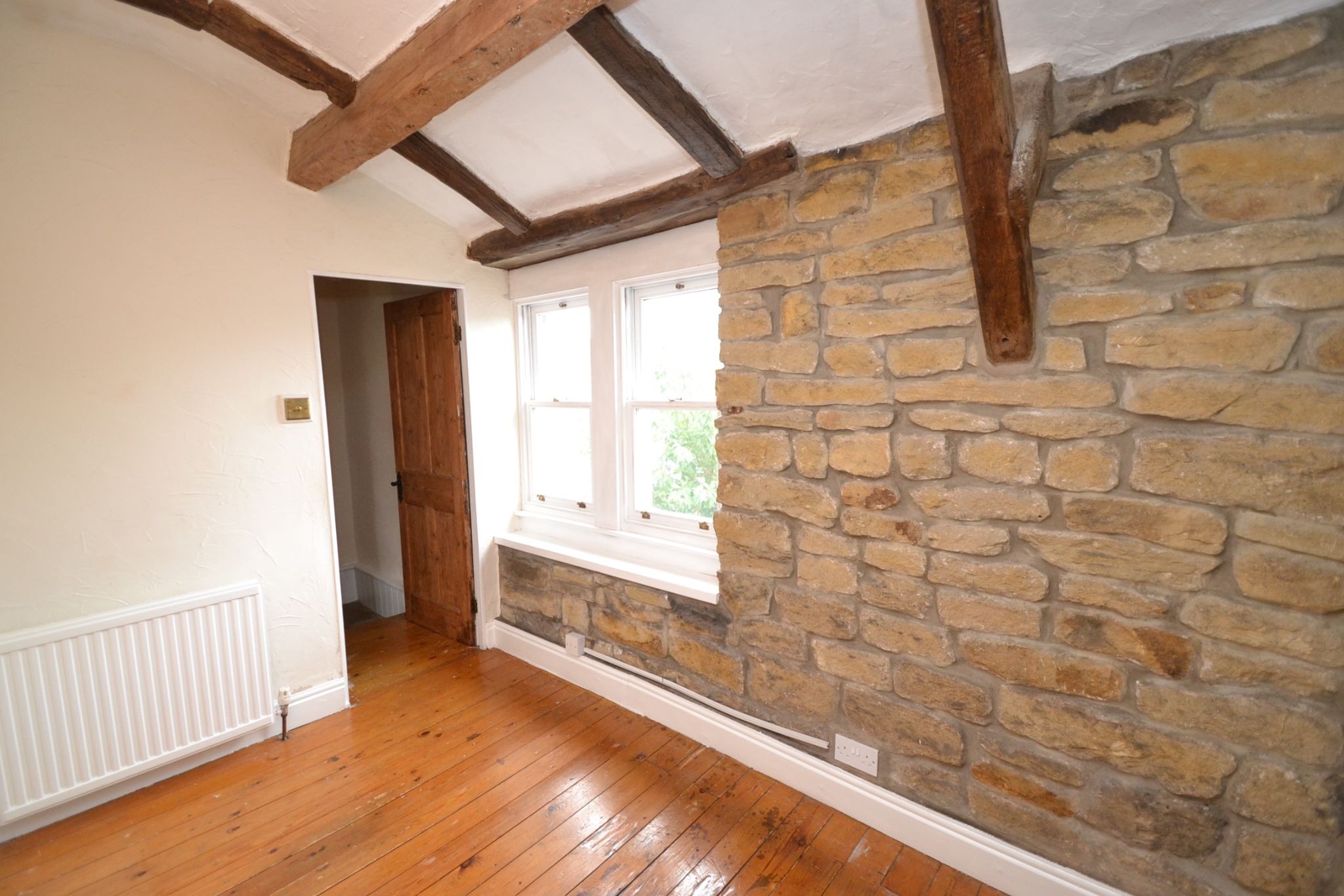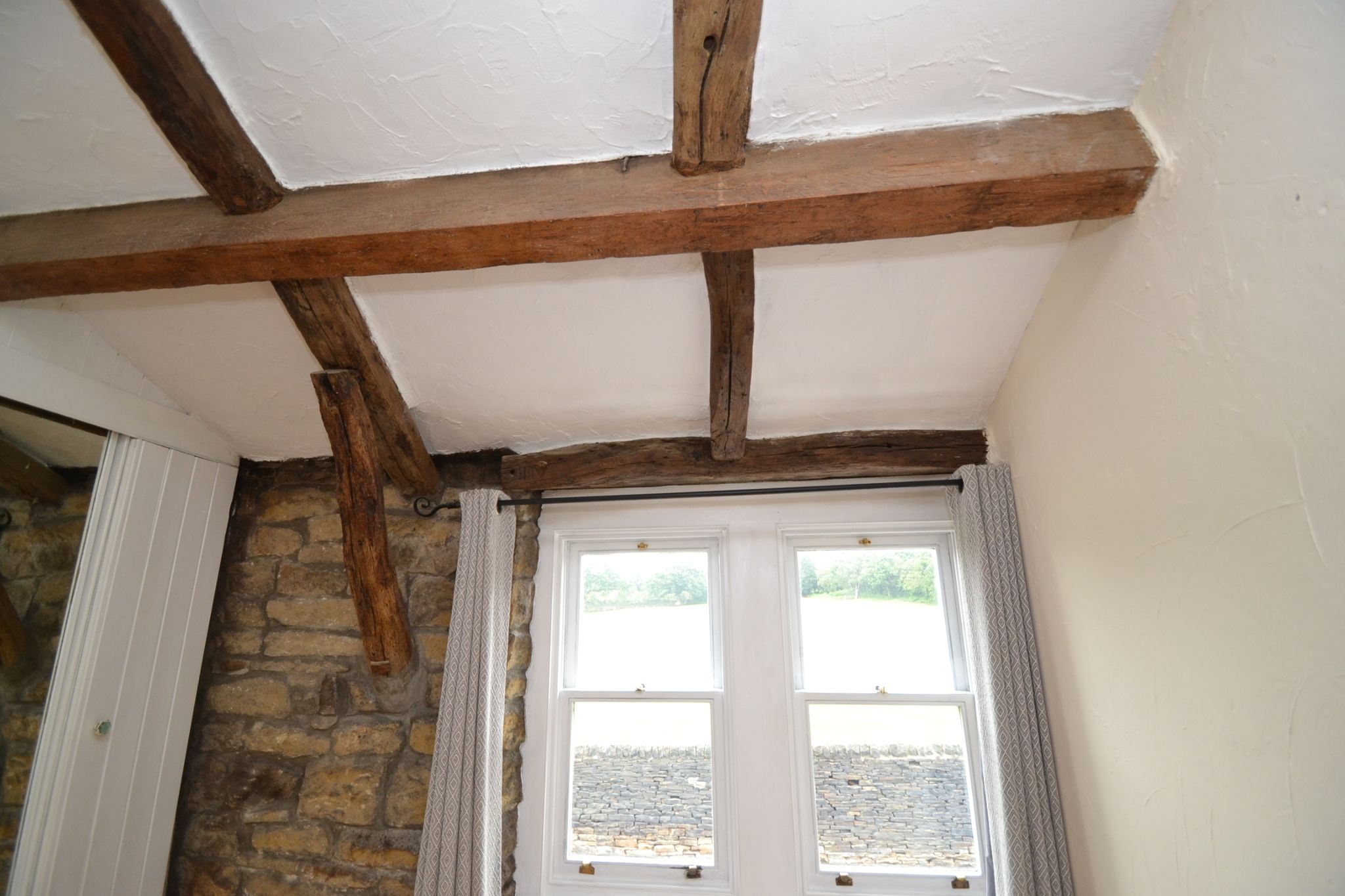 Bedroom 2: Exposed stone wall, radiator, dg wood sash mullion style window to rear, beam features, polished wood floor.
