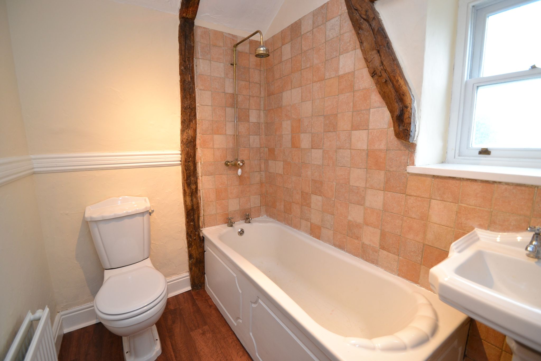 Bathroom: Three piece suite in white, part tiled, thermostatically controlled chrome shower unit over the bath, frosted wood dg window, radiator, cupboard.
