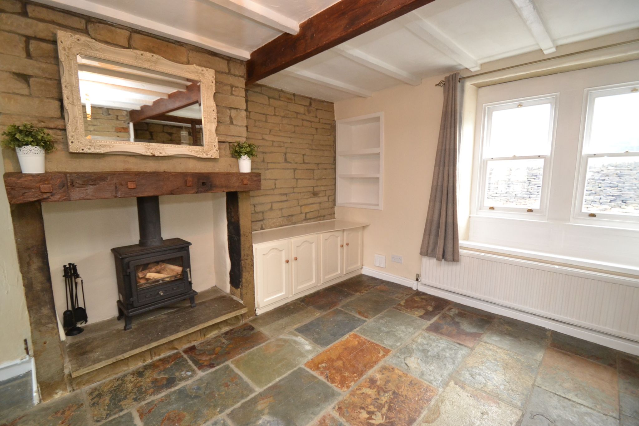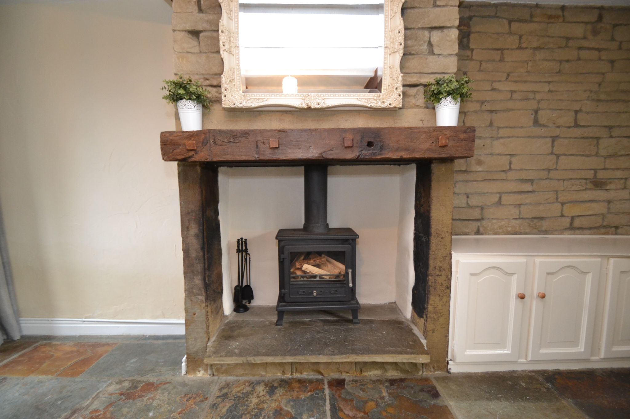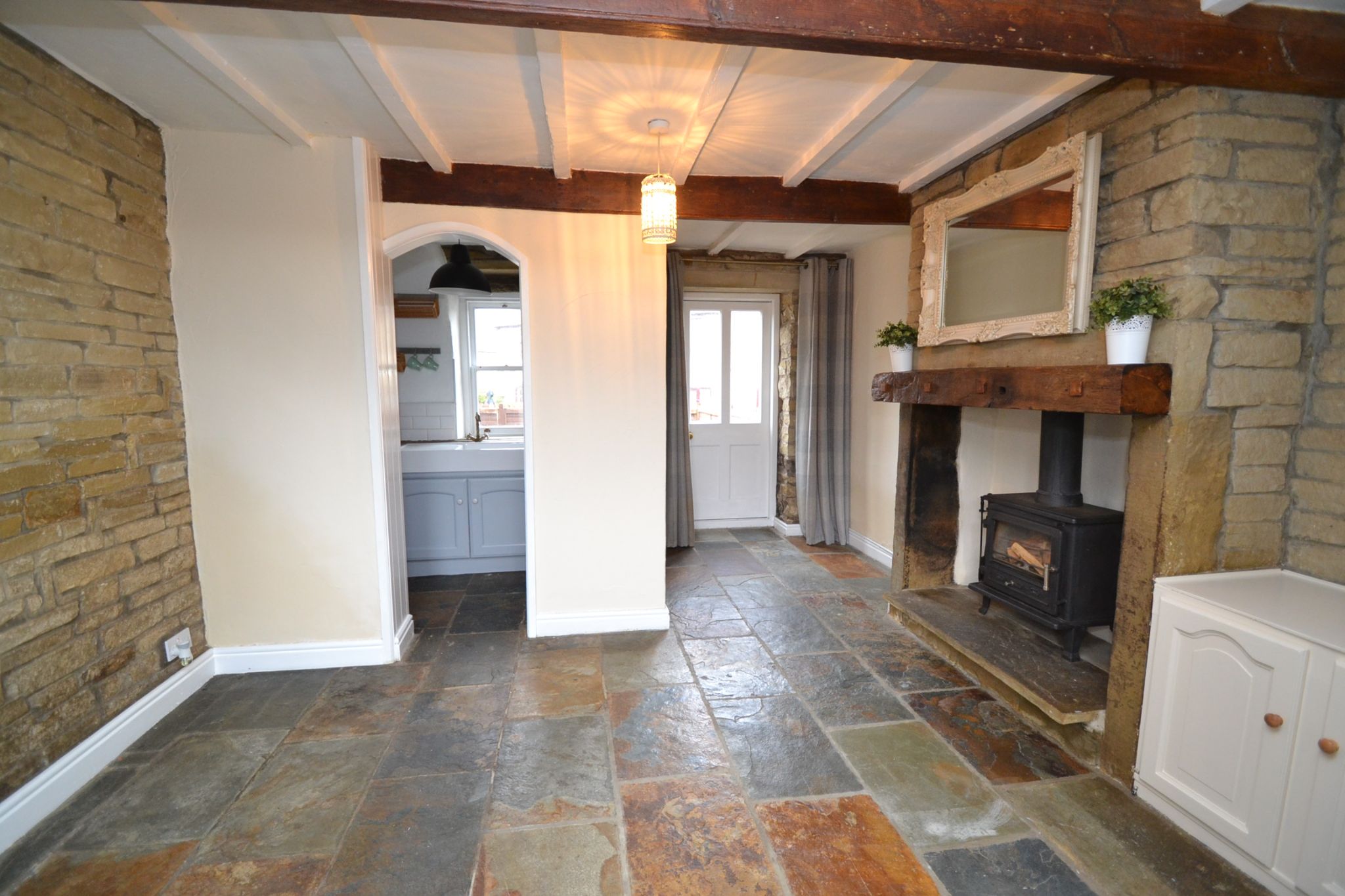 Lounge: Mullion style sash double glazed wood windows with bench seat under, radiator, beams, exposed stone walls, feature solid wood oak lintel over the inglenook fireplace with wood burning stove, base unit cupboard, rear wood dg timber door, Yorkshire stone flagged floor, archway leads onto the: