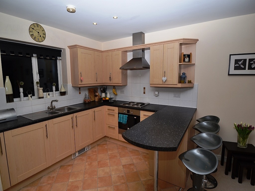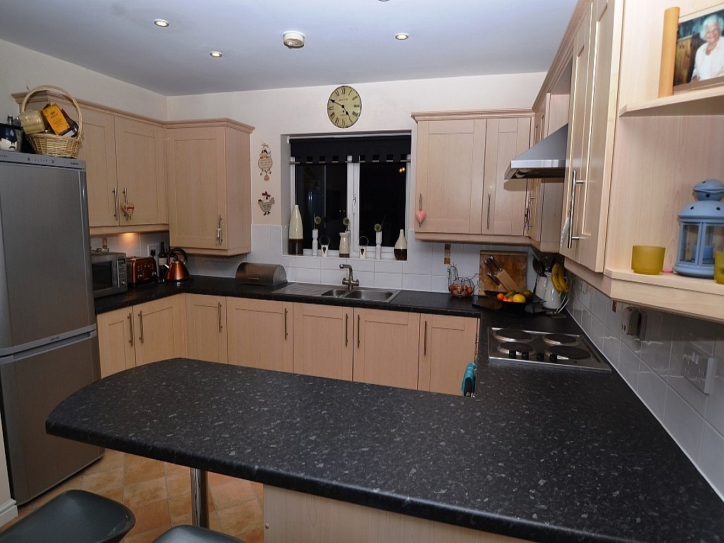 Lounge Diner Kitchen: 23'4 x 13'1. Upvc dg windows to front side & rear double ch radiator, TV & telephone points, carpeted in the lounge. The kitchen has a range of wall & base units in beech with stainless steel handles, granite effect work tops with tiling above, stainless steel extractor hood over a 4 ring gas hob, and built in electric oven all in stainless steel and by Bosch, integrated auto-washer, dryer, tall boy fridge freezer, kick heater, stainless steel 1.5 sink with mixer tap, down lighting.