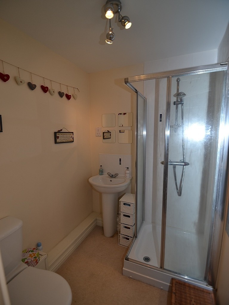 En-Suite Shower Room: 6'3 x 5'2. Wash basin and wc in white, fully tiled shower cubicle with chrome thermostatically controlled, extractor, ch radiator.