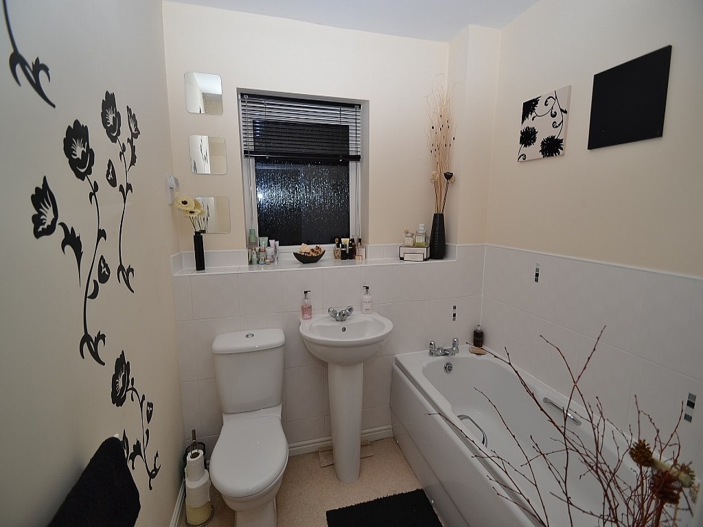 Bathroom: 6'8 x 6'4. Three piece suite in white, part tiled, chrome fittings, ch radiator, frosted Upvc dg window, extractor, electric shaving point.