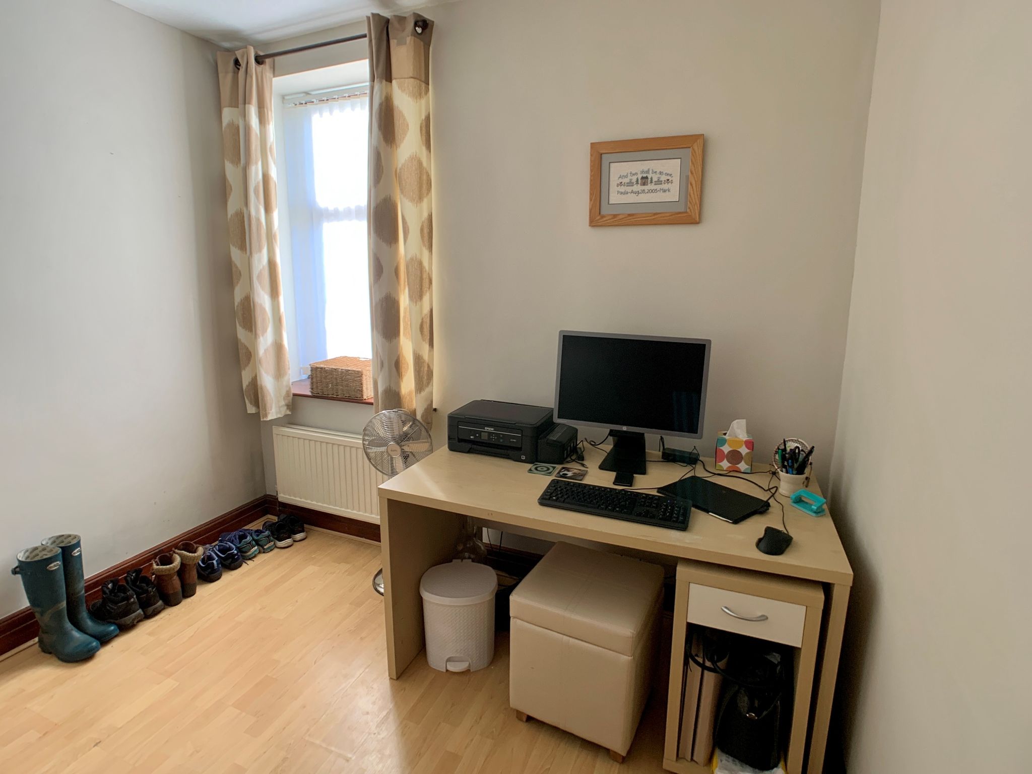 Bedroom 2: Wood dg window to side with fitted blind, radiator, laminate floor.