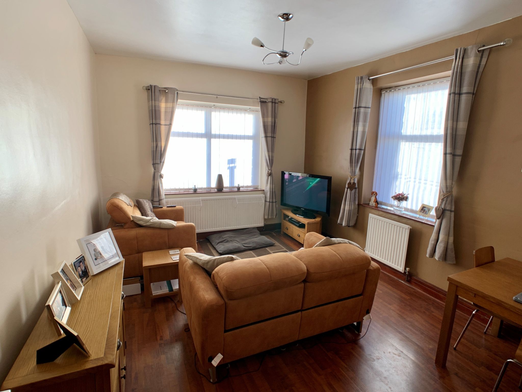 Lounge: Two hard wood dg windows to front & side with fitted blinds, two radiators, laminate floor.