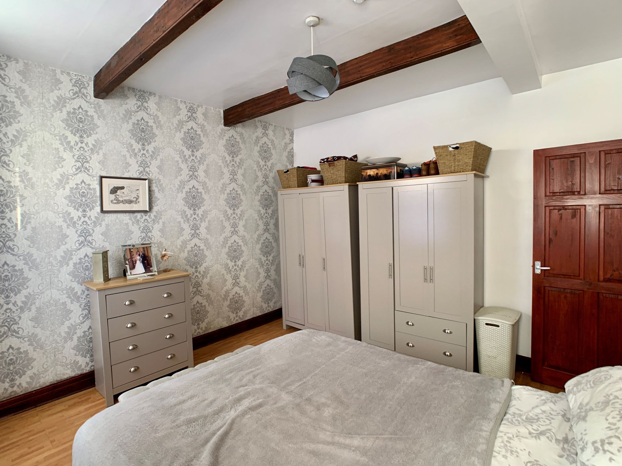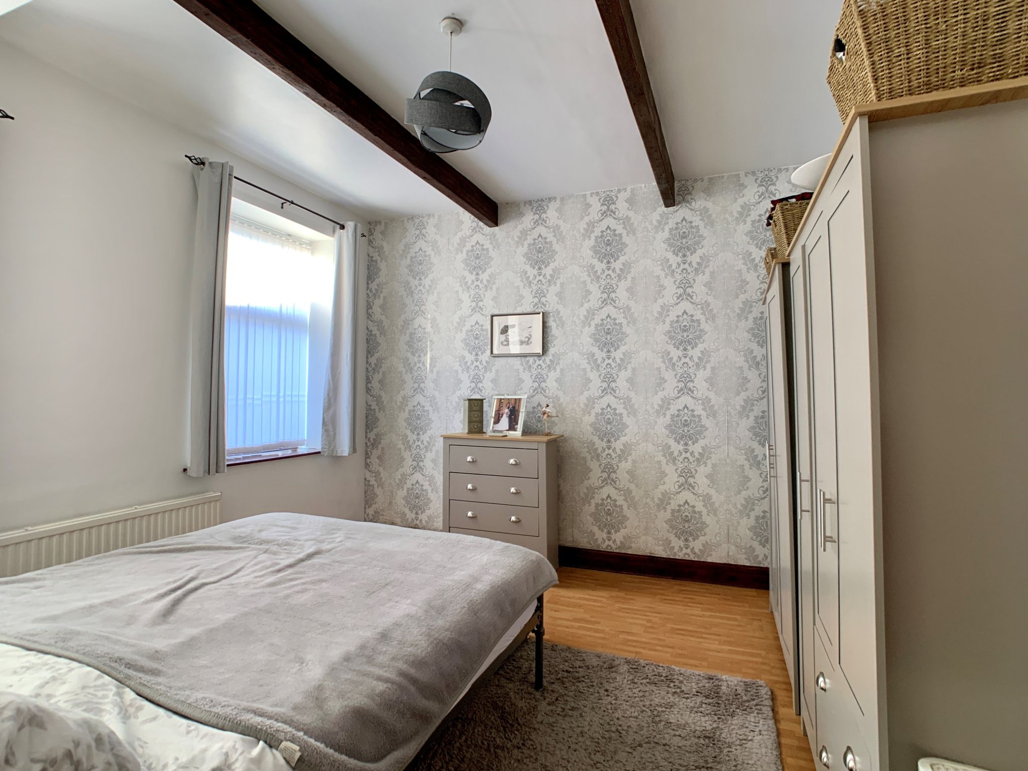Bedroom 1: Two hard wood dg windows with fitted blinds to side, radiator, two beam features to the ceiling, laminate floor.