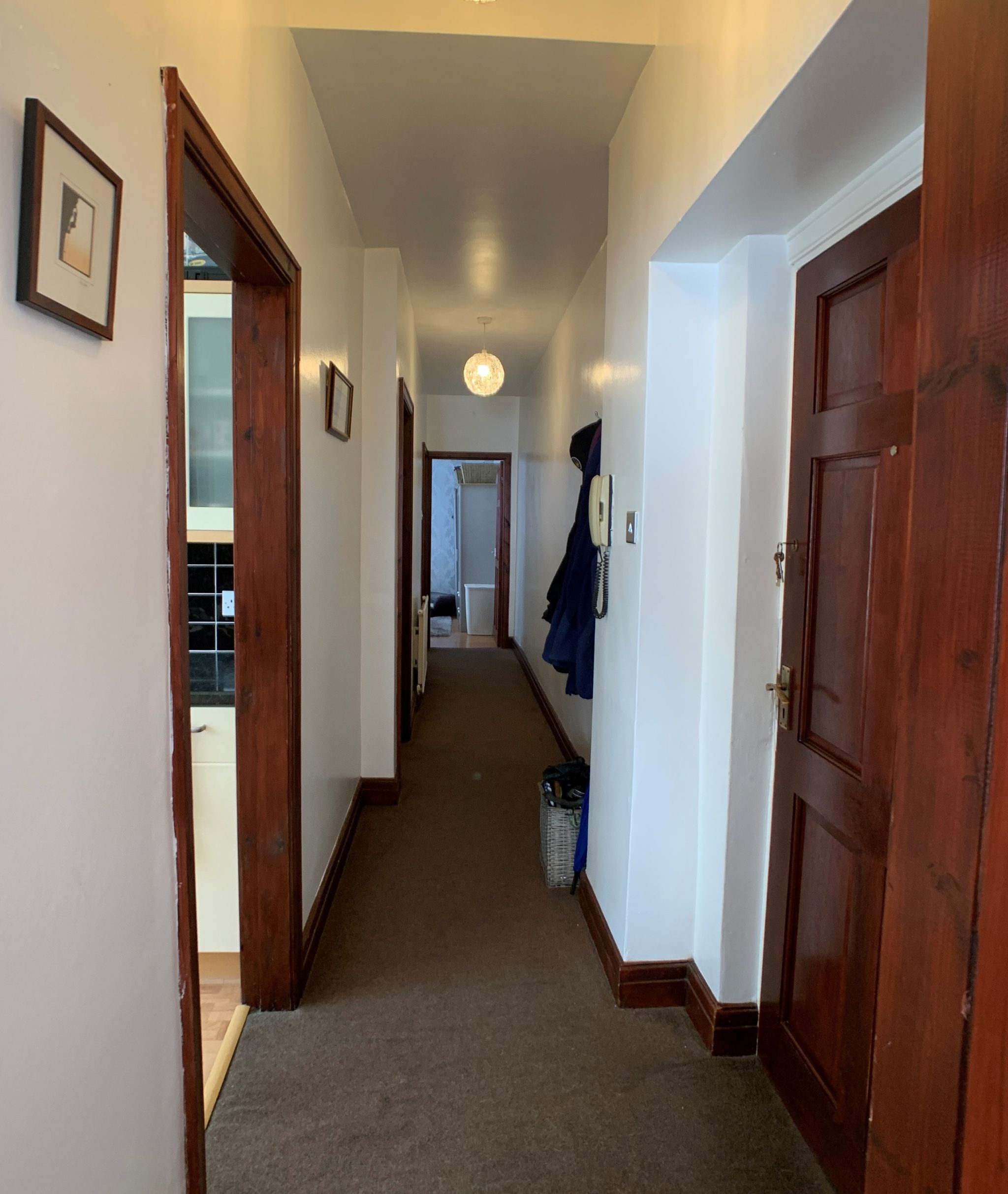 Hallway: Radiator, carpeted, telephone intercom.