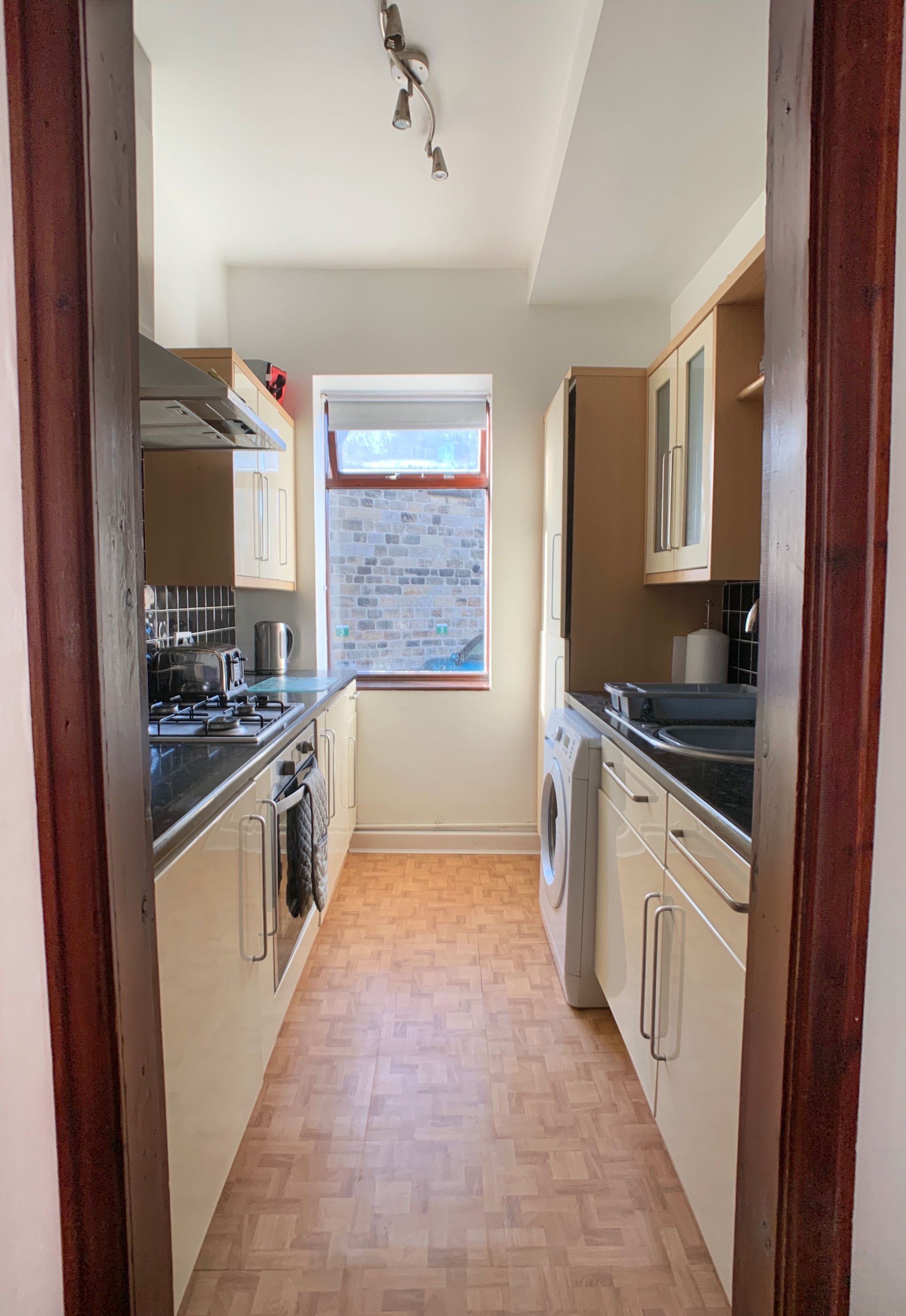 Kitchen: Range of fitted units, work tops with tiling above, dg wood window, stainless steel extractor over a 4 ring gas hob and built in stainless steel electric cooker, integrated fridge and freezer, stainless steel bowl sink with a mixer tap, plumbed for an auto-washer, cupboard houses the combi-boiler.