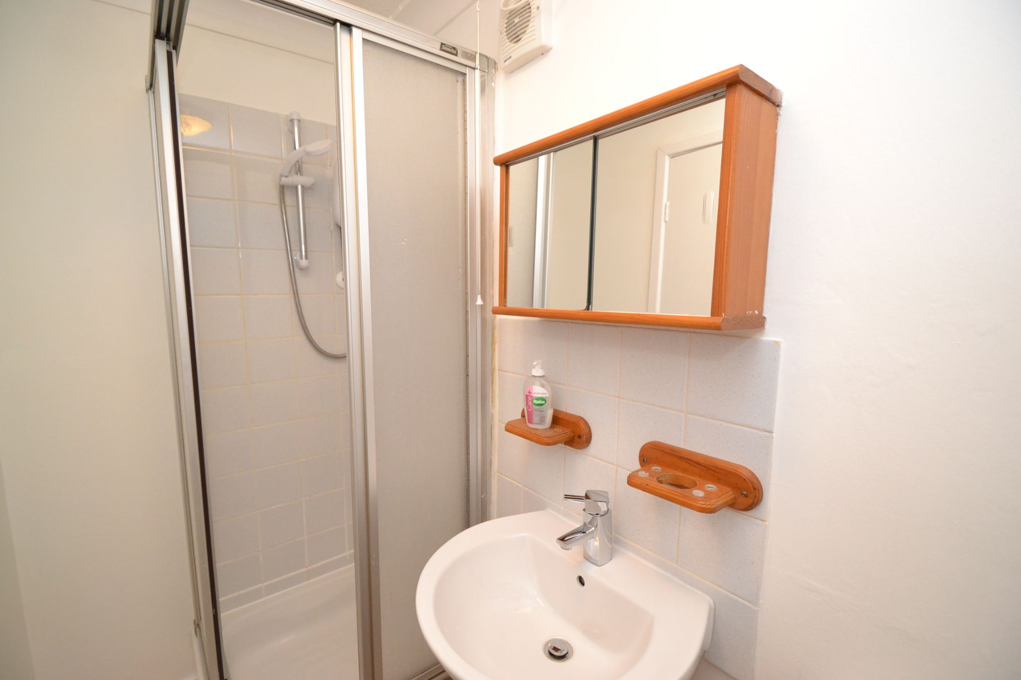 Shower Room: Tiled shower cubicle with an electric shower unit, extractor, wash basin and wc, radiator.