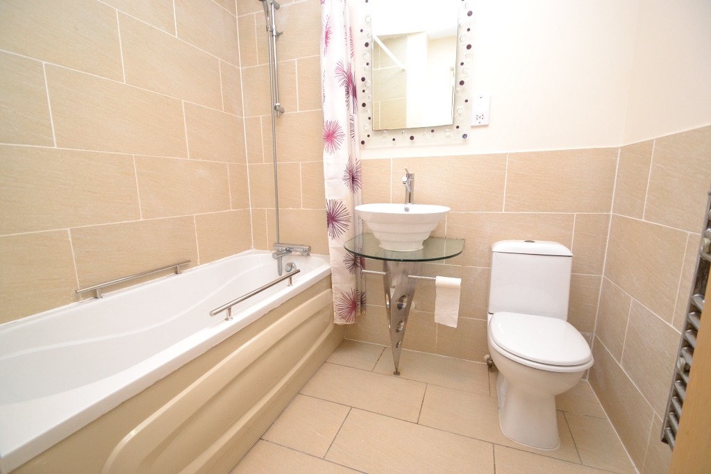 Three piece suite in white, shower over the bath, extractor, heated chrome towel rail.