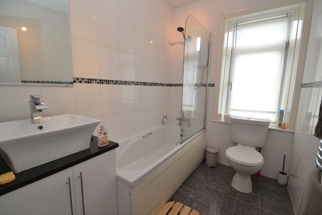 Bathroom: Modern three piece suite in white, fully tiled to the walls and floor, shower screen with electric shower over the bath, chrome fittings, wash basin set on a vanity unit, heated chrome towel rail, frosted Upvc dg window.