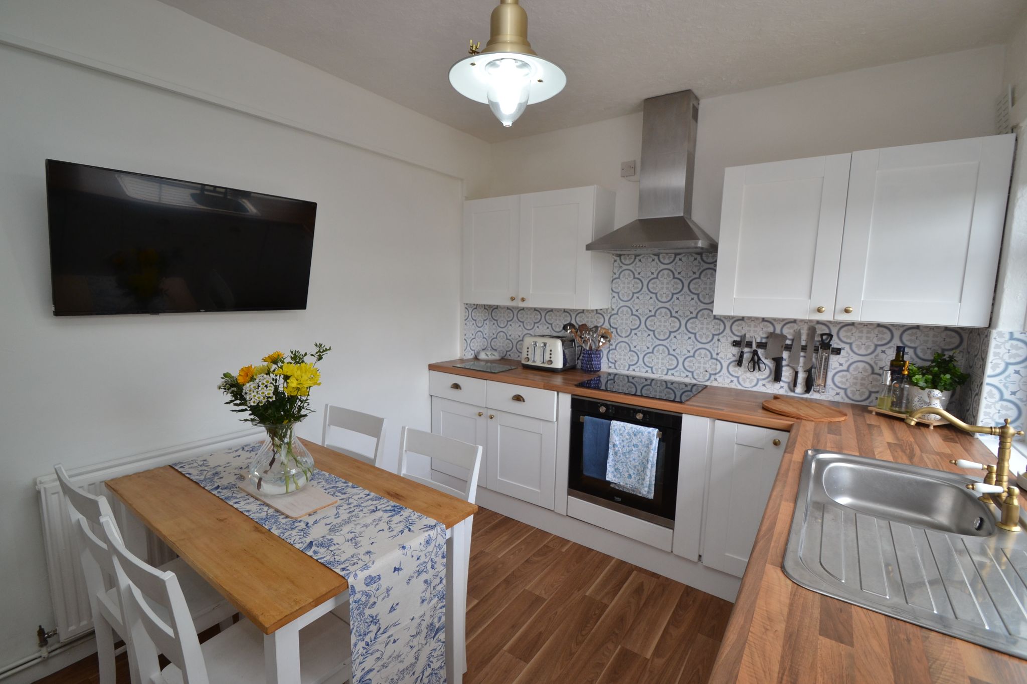 Kitchen Diner: 4.06m x 2.73m (13'3 x 8'9). Range of wall & base units in white, work tops with tiling above, glass splash back and an induction ceramic hob, stainless steel extractor hood over, built in Beko electric oven, stainless steel sink with a brass mixer tap, Upvc dg window to rear, plumbed for an auto-washer, double radiator. Space for a table and chairs, two useful storage cupboards, one a pantry houses the boiler, and the other an under stairs cupboard, rear Upvc entrance door.