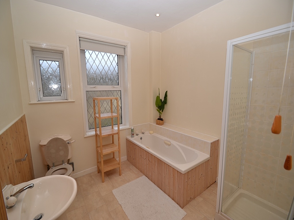 Bathroom: 9'1 x 9'0. Three piece suite, part tiled, separate shower cubicle with electric unit, ch radiator, two diamond leaded Upvc dg windows, inset ceiling lights.
