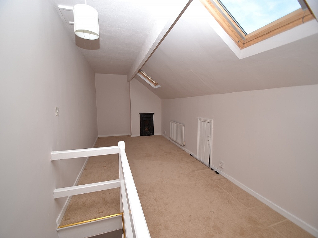 Second Floor: Bedroom 2: 23'1 x 9'1. Under drawing storage, ch radiator, two dg velux windows, cast iron painted black fireplace feature.