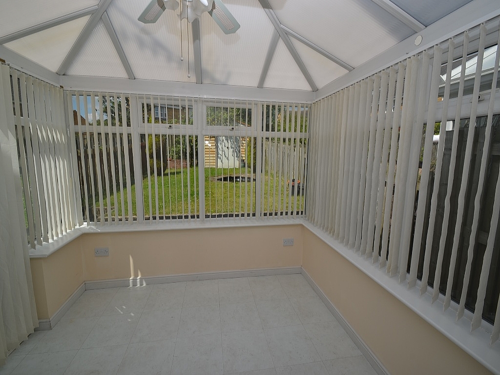 Upvc dg Conservatory: 9'9 x 9'0. Apex roof, side French doors, light/ceiling fan, fitted blinds.