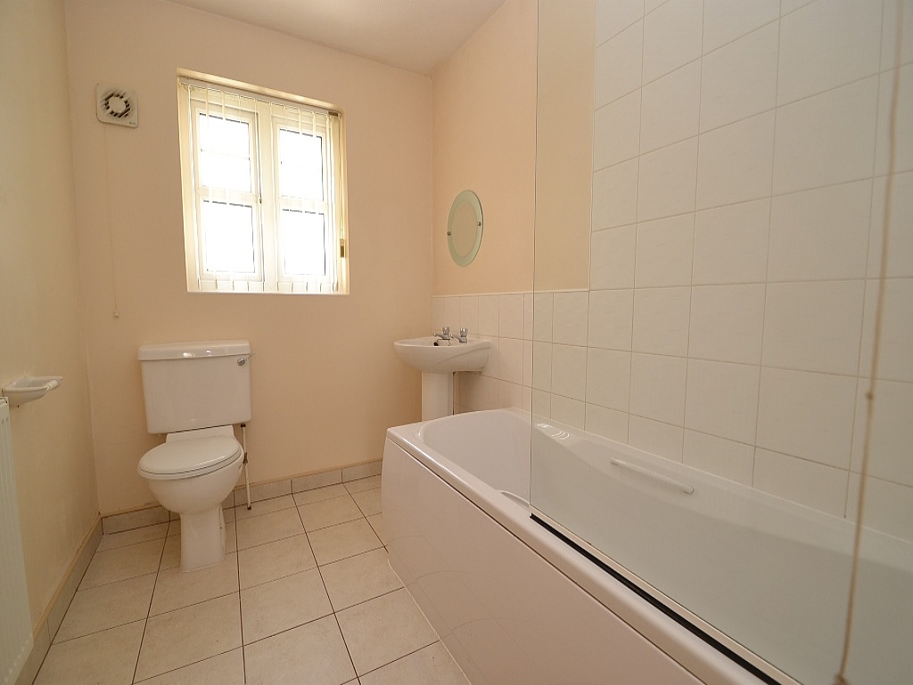 Bathroom: 8'5 x 6'1. Three piece suite in white, part tiled, shower glass screen, chromew thermostatically controlled shower unit, ch radiator, frosted Upvc dg window, tiled floor.