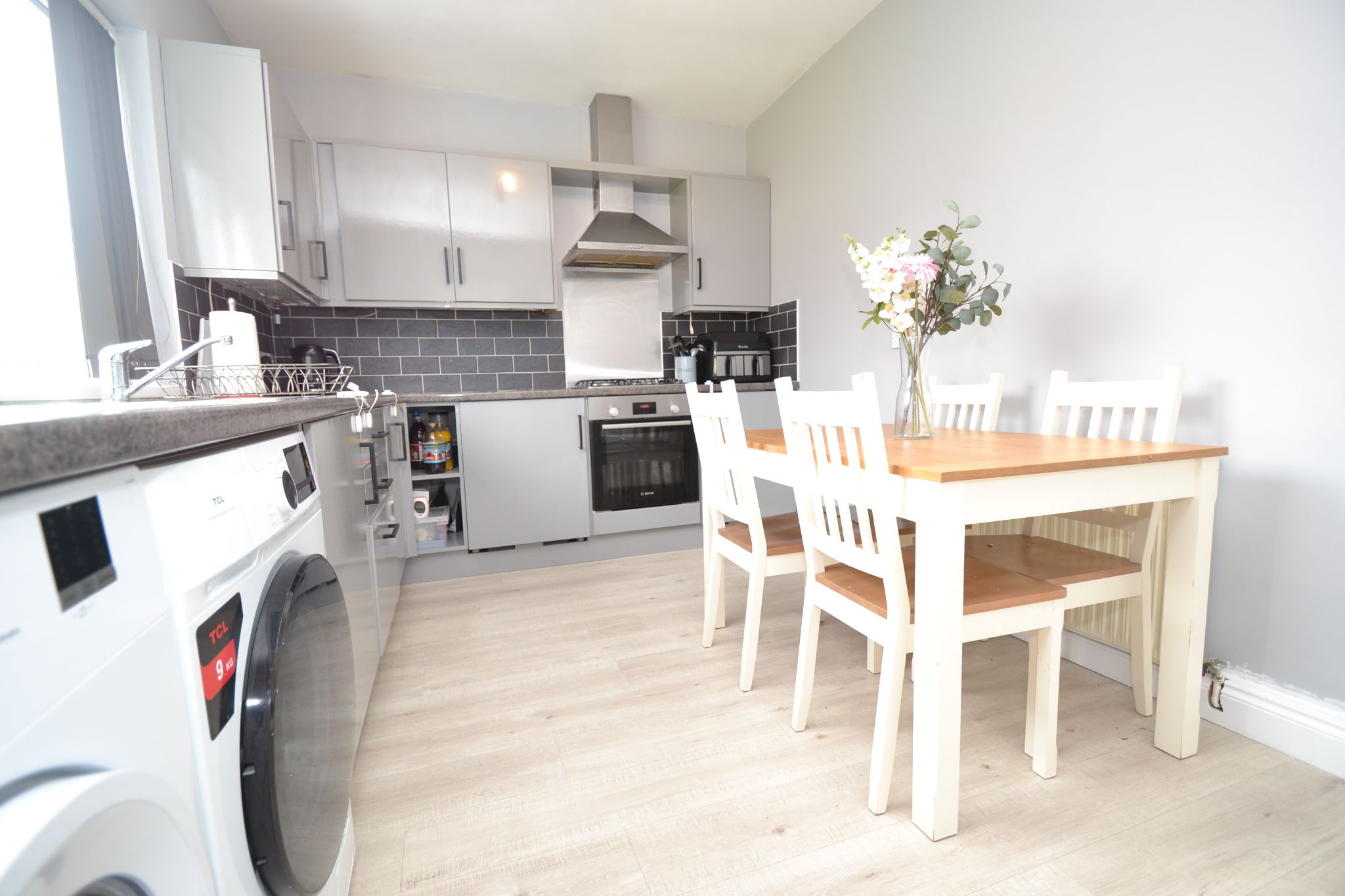 Kitchen Diner: 4.08m x 2.74m (13'3 x 8'9). Excellent range of modern wall & base units in grey, work tops with tiling above, integrated fridge and freezer, stainless steel extractor hood with a matching splash back, plus a 4 ring gas hob, built in electric oven by Bosch all in stainless steel, Upvc dg window to rear with a fitted blind, stainless steel 1.5 sink with a mixer tap, plumbed for an auto-washer and dryer, space for a table and chairs, radiator. Internal door leads to a useful storage cupboard, shelving and houses the consumer unit.