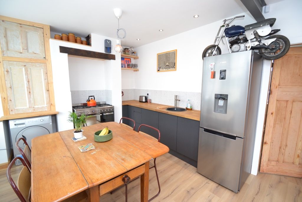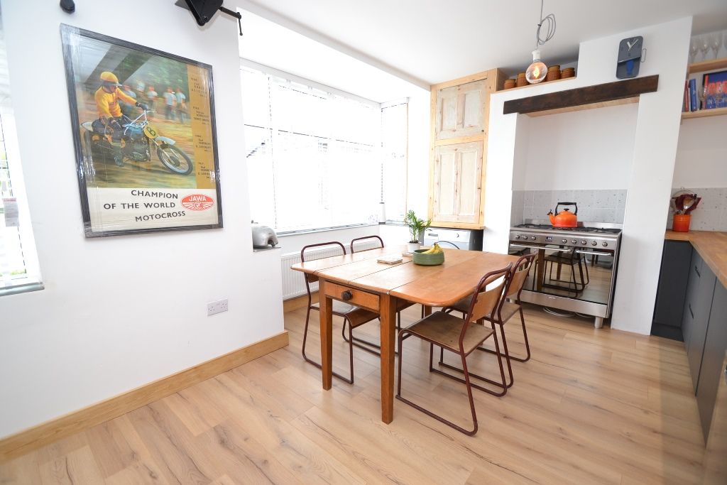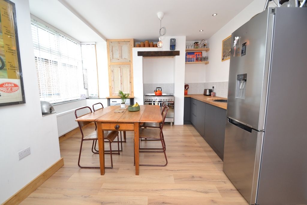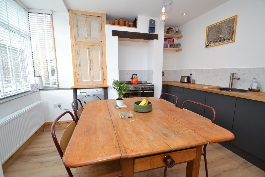 Kitchen Dining Room: 4.80m x 3.08m (15'8 x 10'1). Range of base units with solid butcher work tops, housing for a gas range with a feature oak lintel above,  plumbed for an auto-washer, bowl sink, shelving, laminate flooring, ch radiator, side Upvc door, Upvc dg windows to rear with a bay and fitted blinds, space for a good size table and chairs, inset ceiling lights.