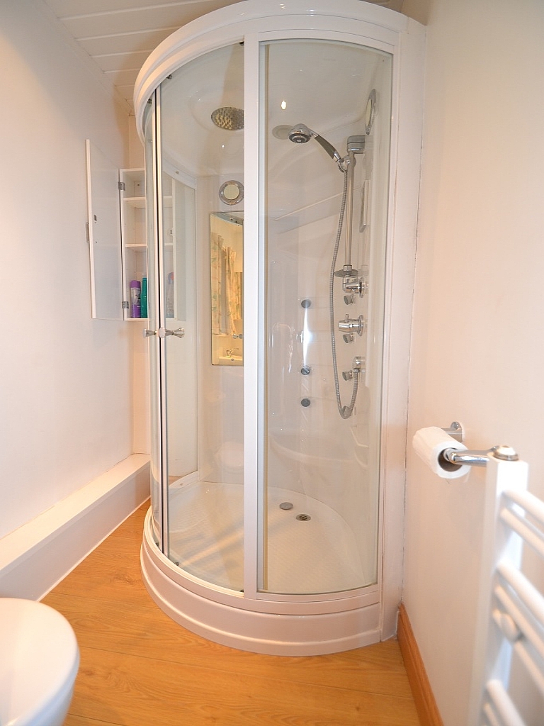 Shower Room: 7'10 x 4'6. Two piece suite in white with wc and wash basin in white, state of the art shower cubicle/spa/radio/led lighting, frosted Upvc dg window to rear, cladded ceiling with inset lighting, heated towel rail, vanity cupboard.