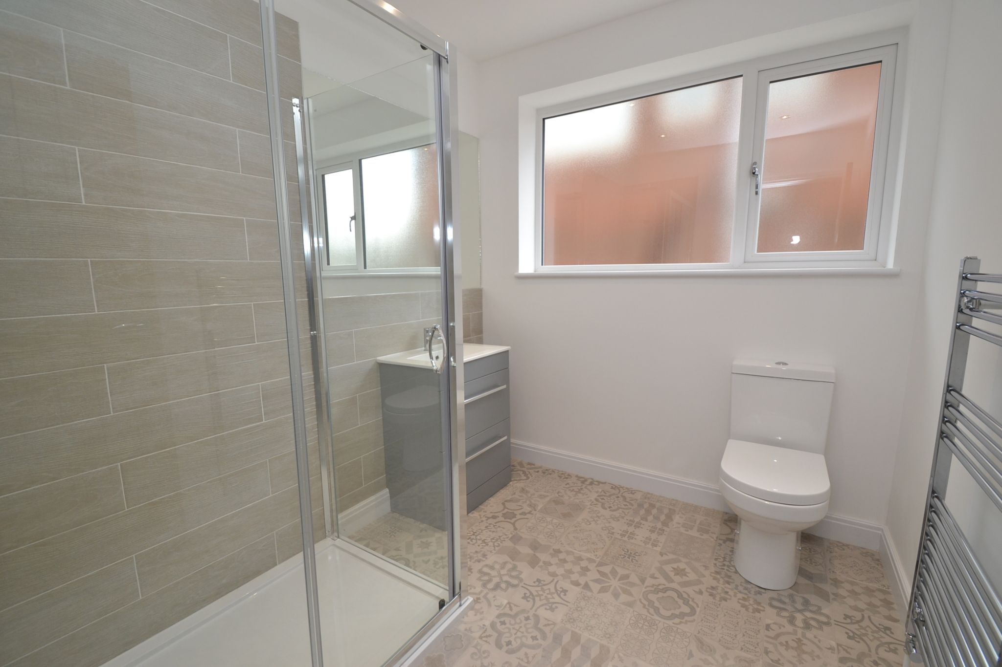 Shower Room: Large walk in shower cubicle with a thermostatically controlled shower unit, inset ceiling lights, extractor, frosted Upvc dg window, heated chrome towel rail, wash basin set on a grey vanity unit, wc.
