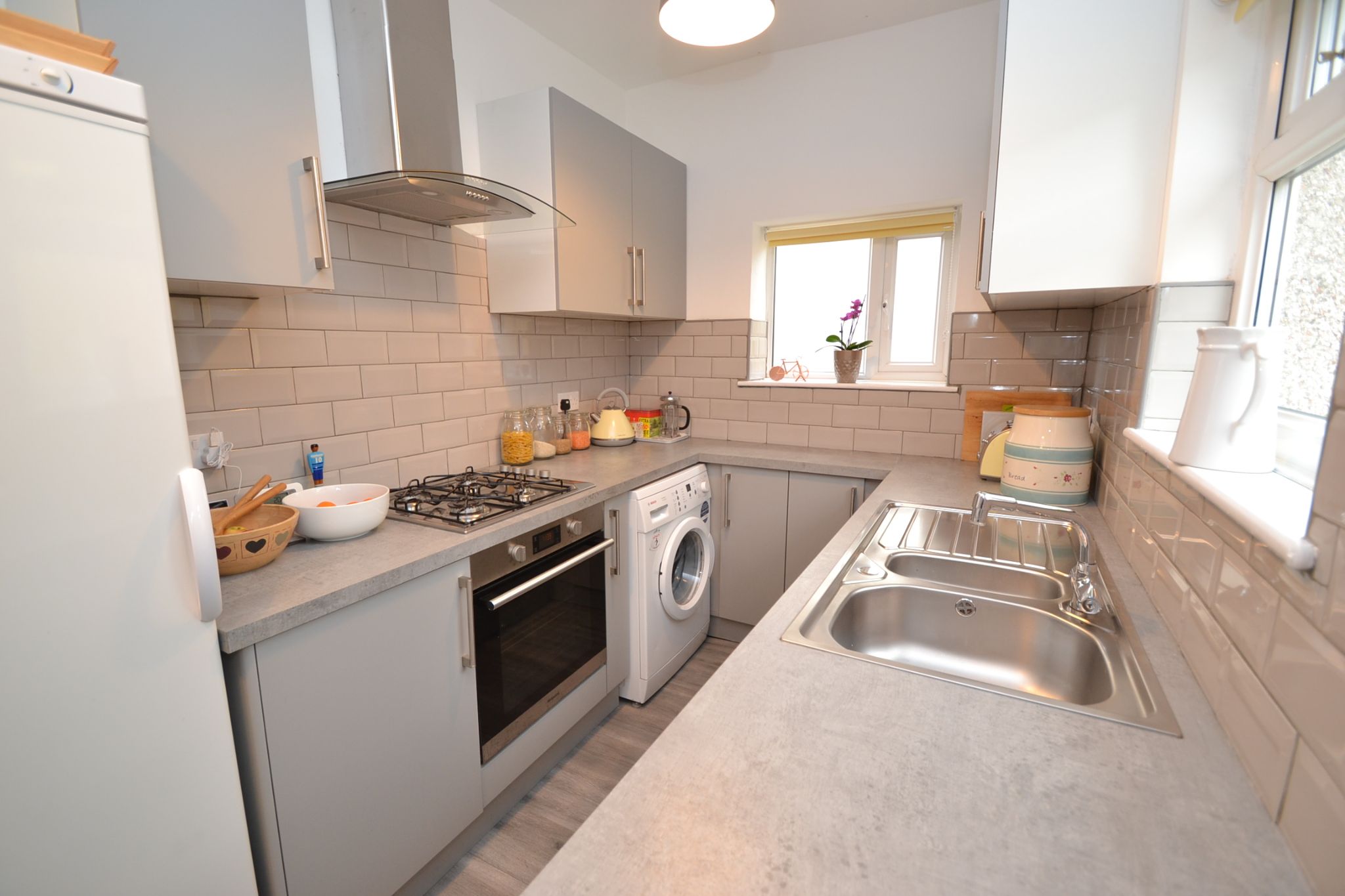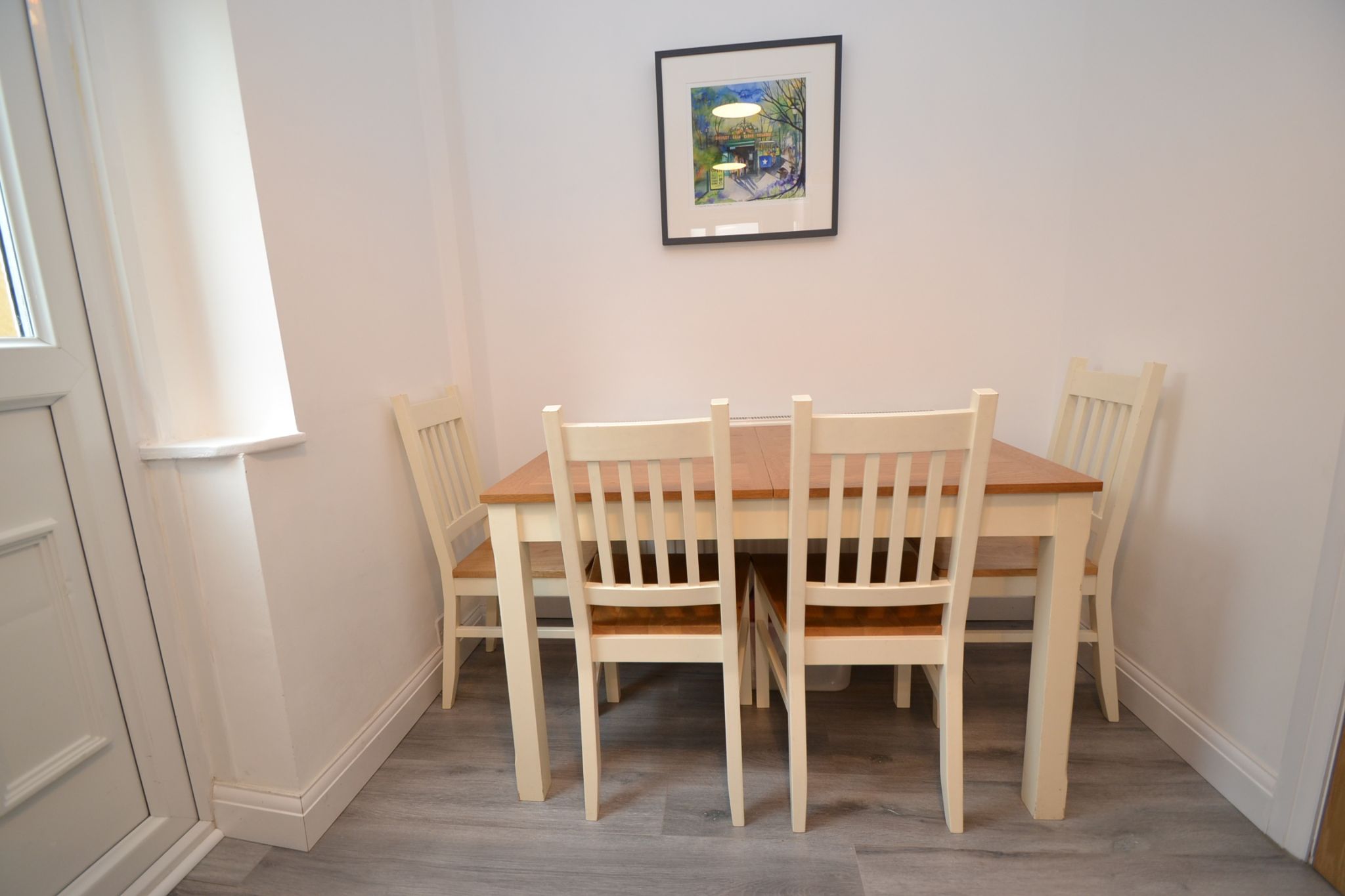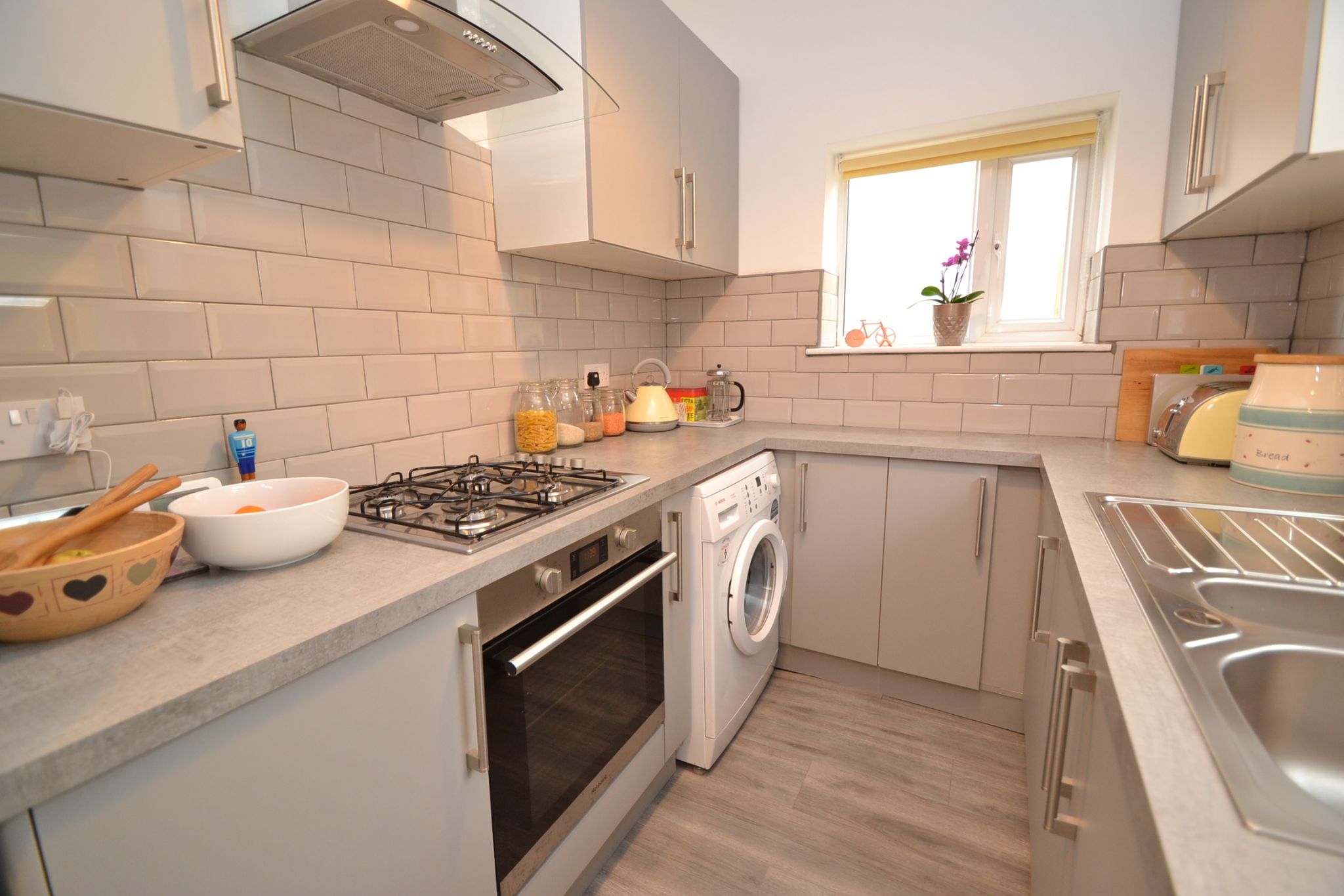 Kitchen Dining Room: 4.70m x 1.99m (15'4 x 6'5). Range of wall & base units, work tops with brick effect tiling above, 1.5 stainless steel sink with a mixer tap, plumbed for an auto-washer, extractor over a 4 ring gas hob and built in electric oven all in stainless steel by Hotpoint, space for a tall boy fridge freezer, area which will accommodate a table and chairs, radiator, laminate floor in grey, Upvc dg windows to side and rear, Upvc door to rear.