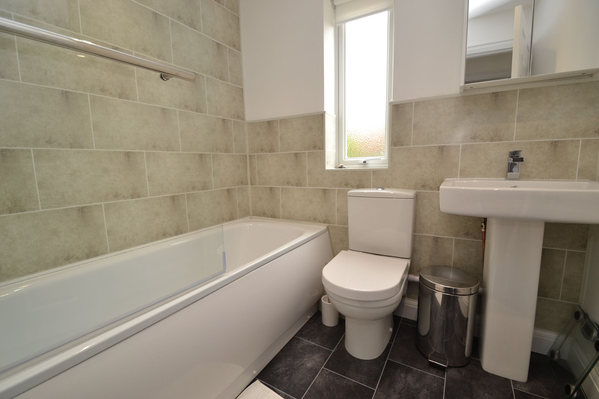 Bathroom: 1.98m x 1.76m (6'5 x 5'7). Three piece modern suite in white, part tiled, chrome mixer shower tap over the bath with a shower glass screen, frosted Upvc dg window, heated chrome towel rail, extractor, inset ceiling lights.