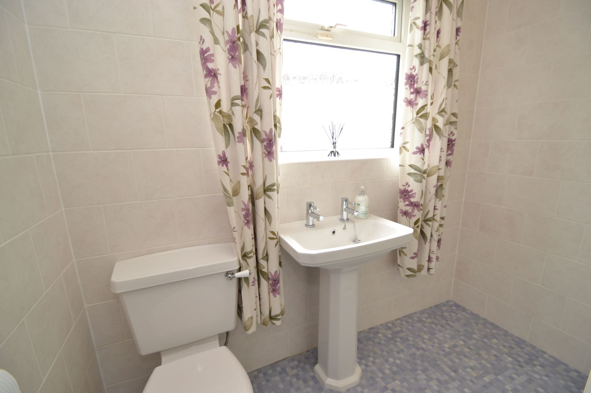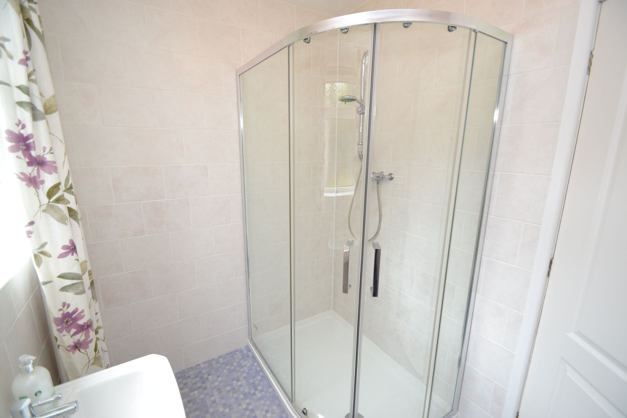 Shower Room: 2.21m x 1.75m (7'2 x 5'7). Wrap around shower cubicle with a chrome thermstatically controlled shower unit, wash basin and wc in white, frosted Upvc dg window, heated chrome towel rail.