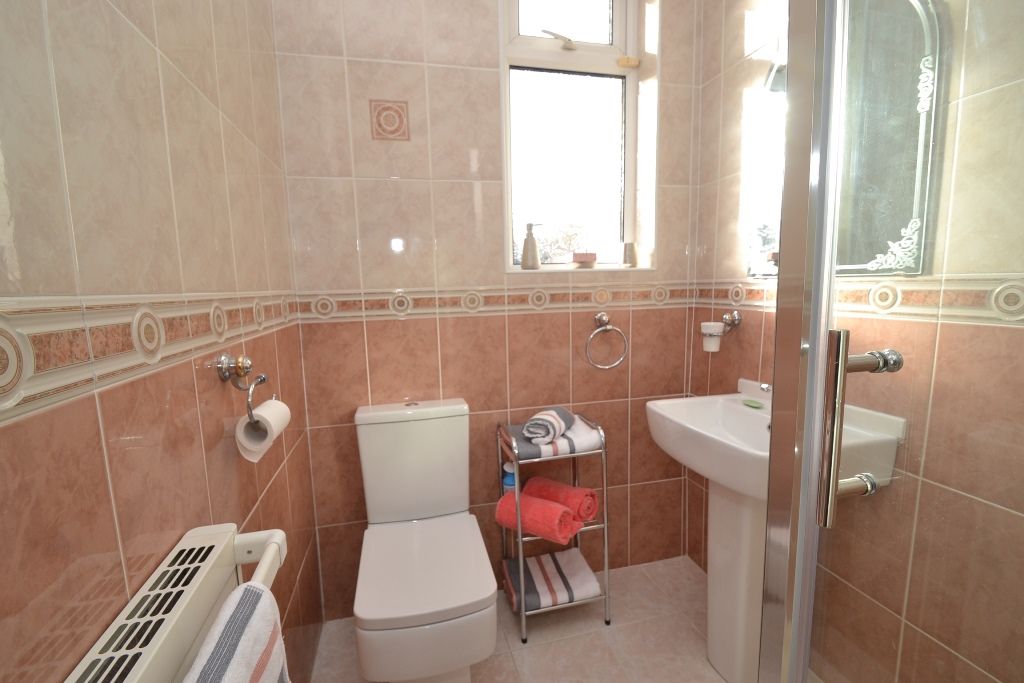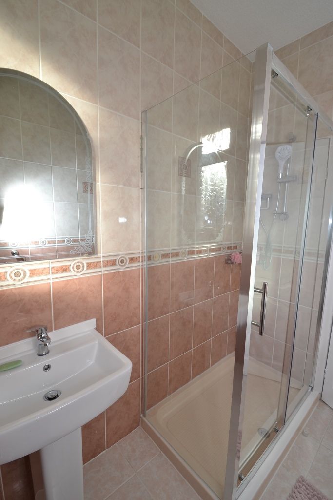 Shower Room: Newly installed shower cubicle with a chrome thermostatically controlled shower unit, new wash basin and wc in white, full contrasting tiling, frosted Upvc dg window, ch radiator.