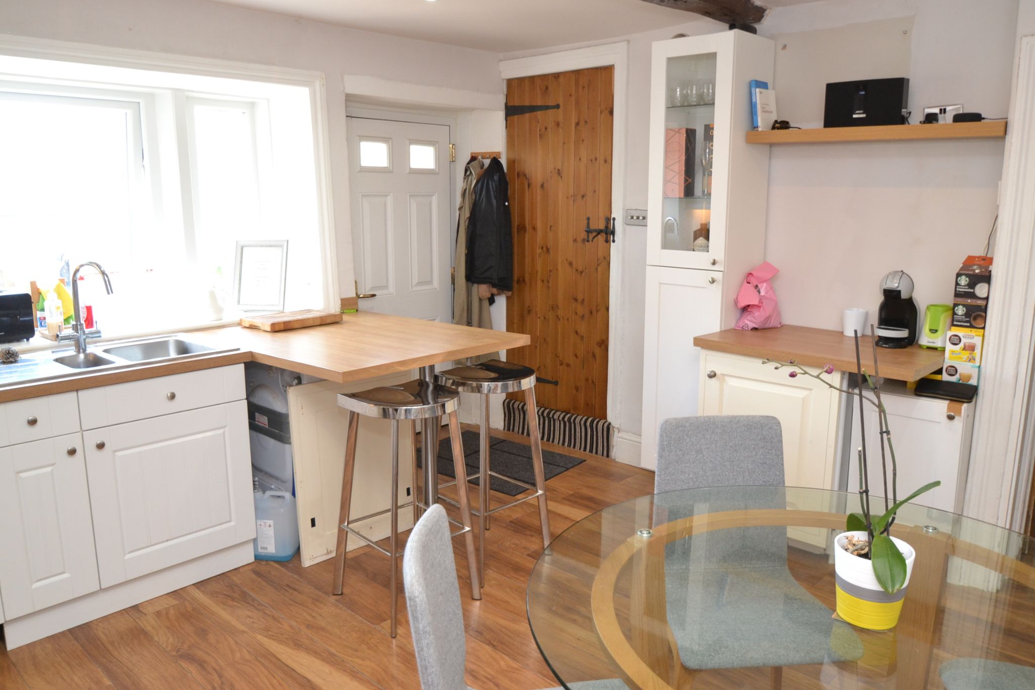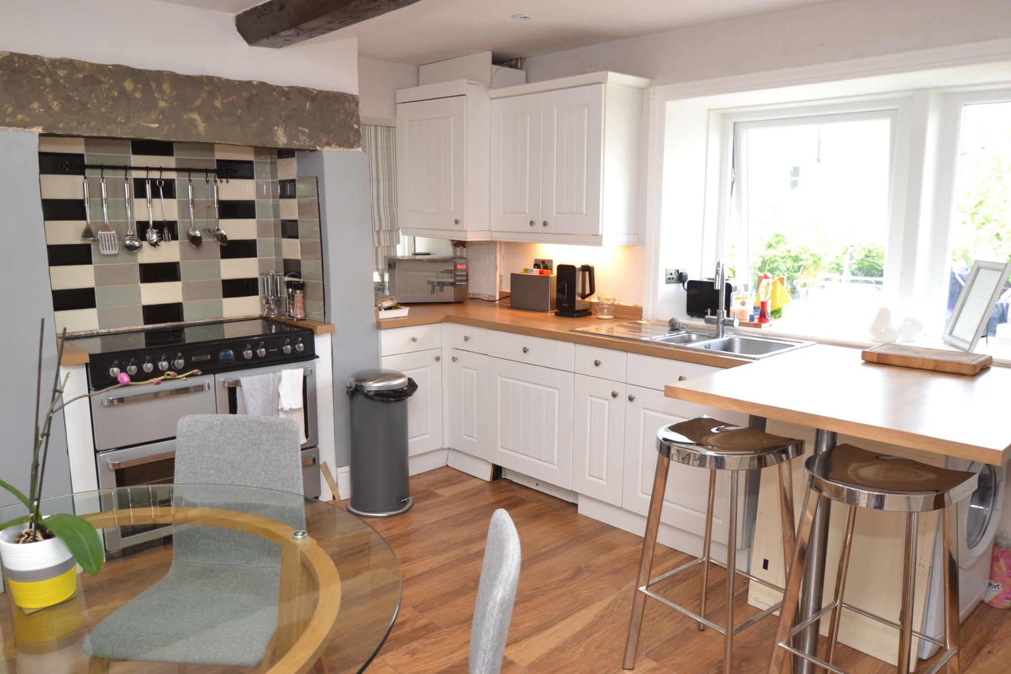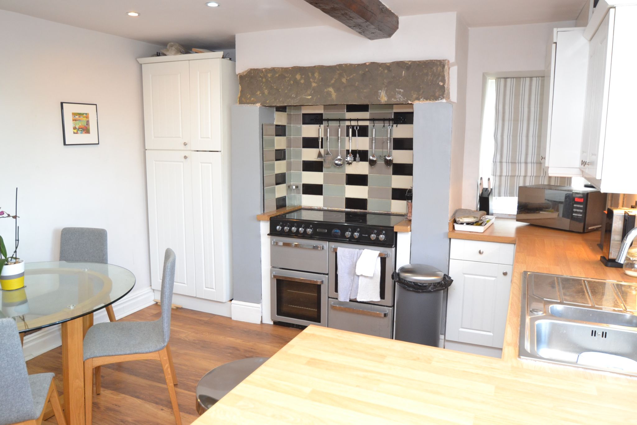 Kitchen Dining Room: 4.52m x 3.69m (14'8 x 12'10). Range of wall & base units, butcher block effect work tops, stainless steel 1.5 sink, cupboard houses the Vaillant condensing boiler, stone lintel over the recessed area comprising of the Roma 100 Range will remain, extractor and light over, tiled into the recess, laminate floor in plank effect, radiator, side Upvc dg, Upvc dg window and composite door to rear.