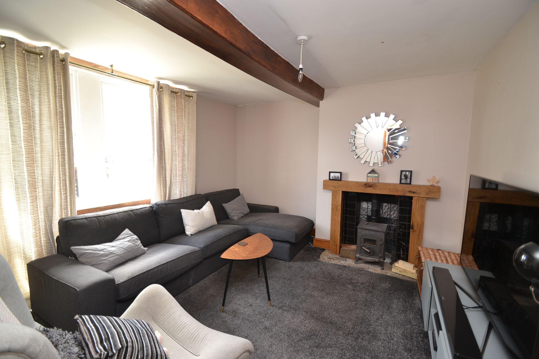 Lounge: 4.33m x 3.59m (14'2 x 11'8). Mullion style Upvc dg windows to front, beam feature, oak fireplace surround with tiled back and hearth along with a wood burning stove, radiator.