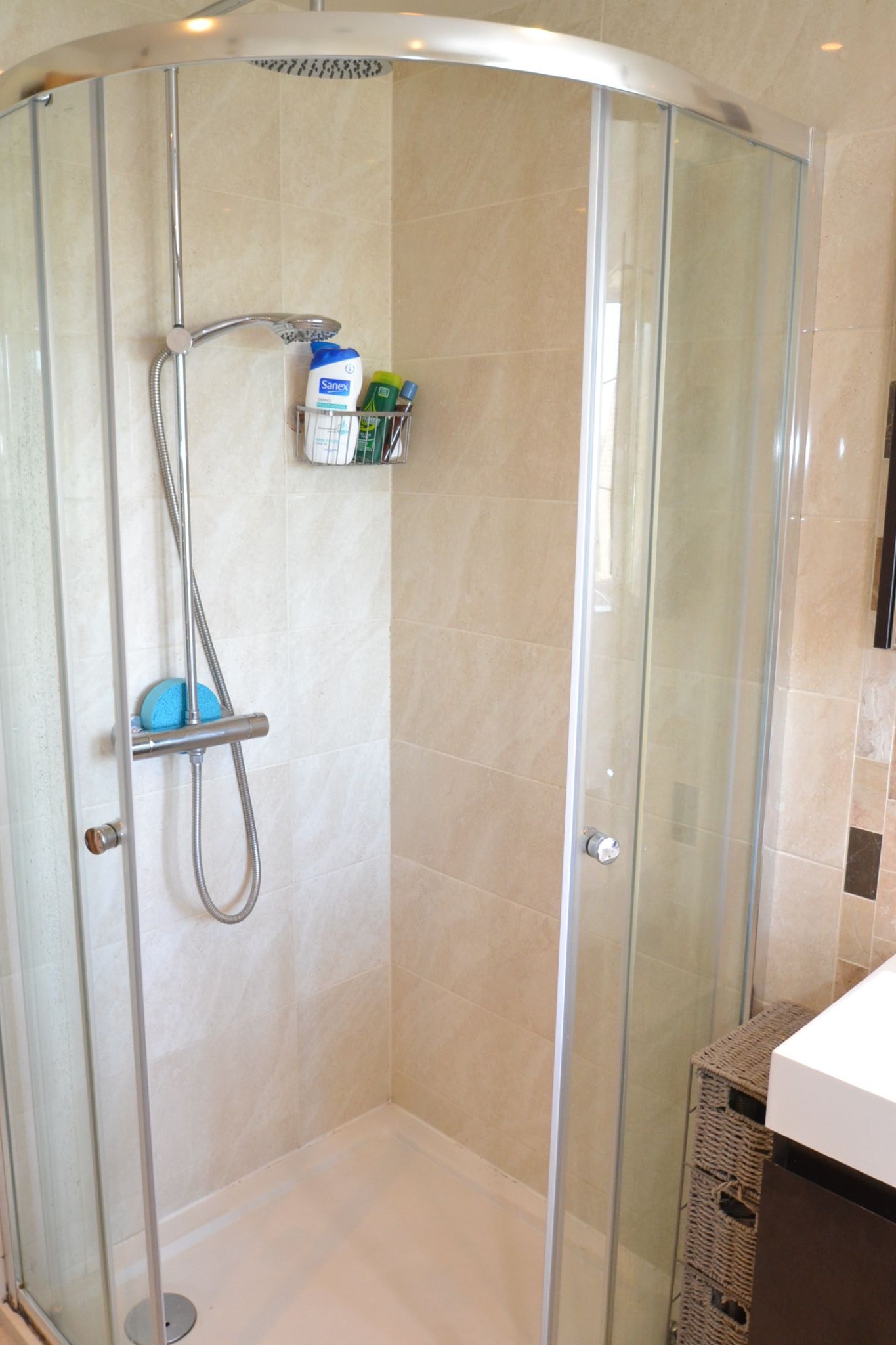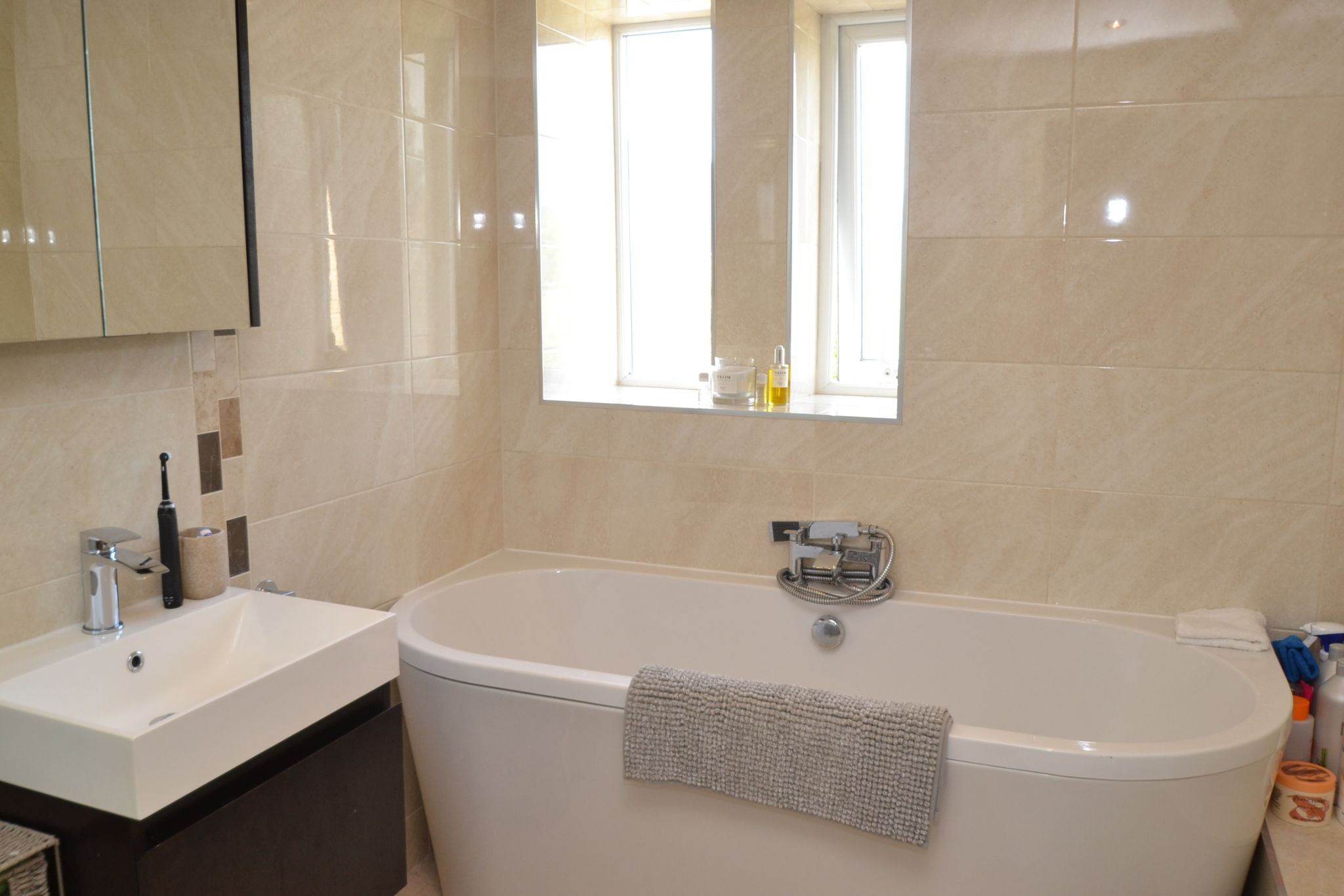 Bathroom: 2.58m x 1.84m (8'4 x 6'0). Large bath in white with monobloc mixer tap, chrome fittings, wash basin set on a vanity unit, wrap around shower cubicle with a chrome thermostatically controlled shower unit, heated towel rail, frosted Upvc dg window, inset ceiling lights.
