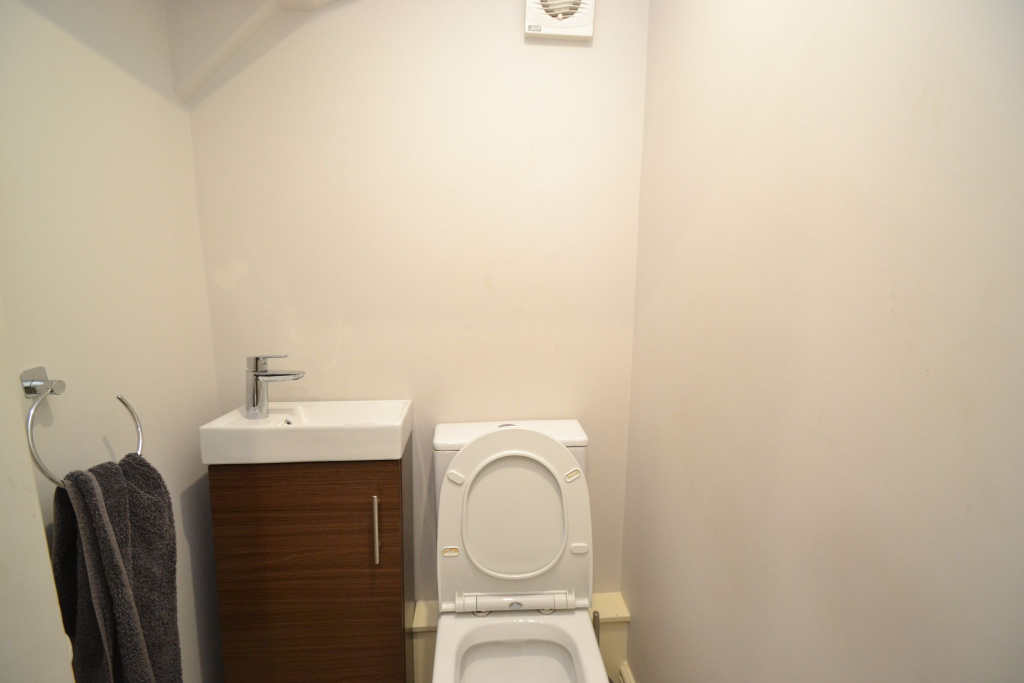 Cloaks: Wash basin set on a walnut effect vanity unit and wc in white, extractor, inset ceiling lights.