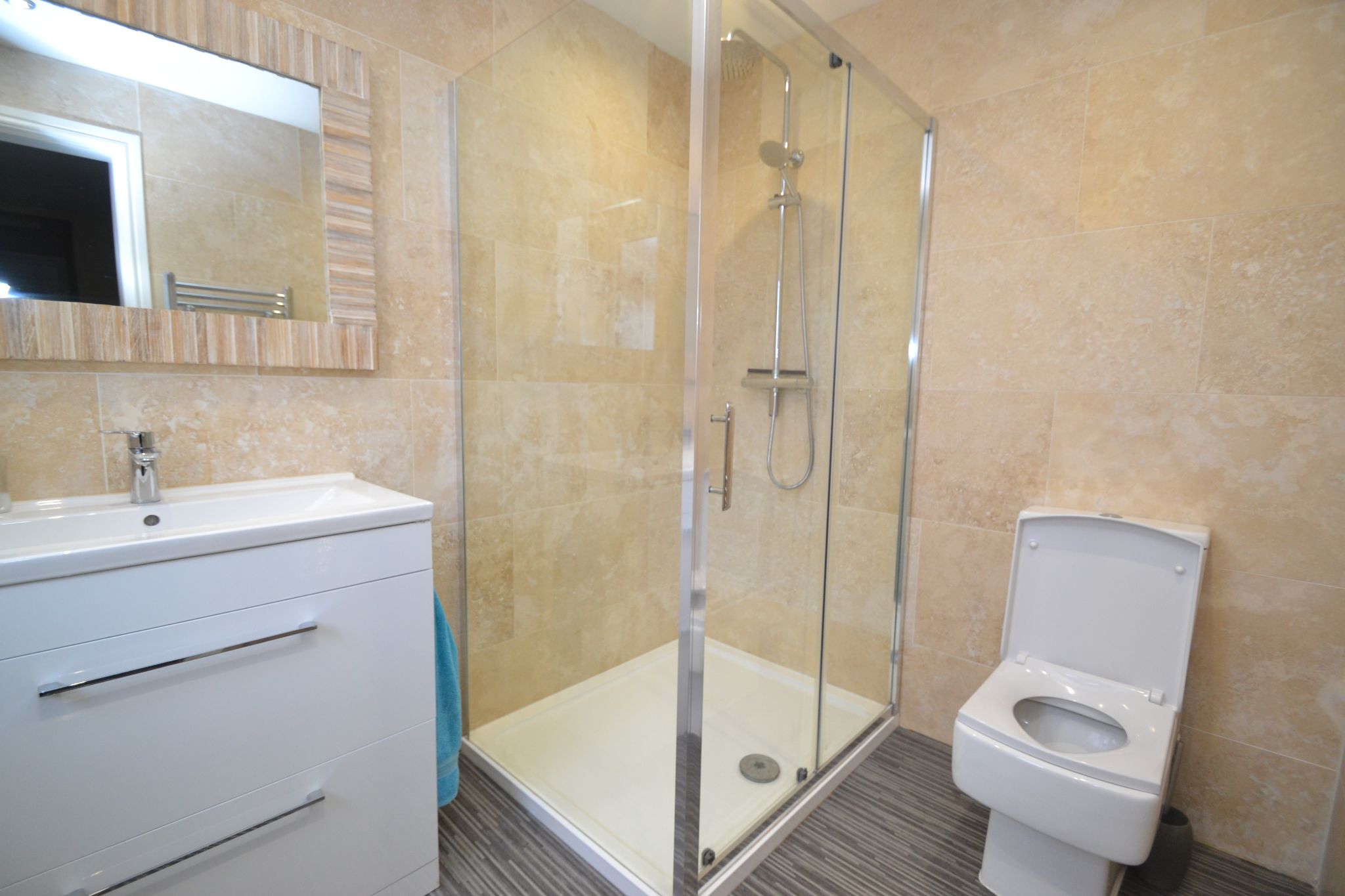 Shower Room: Walk in shower cubicle with a chrome thermostatically controlled shower unit, wash basin set on a high gloss vanity unit, wc, wall mirror, fully tiled in stone effect tiles, frosted Upvc dg window, heated chrome towel rail, extractor.